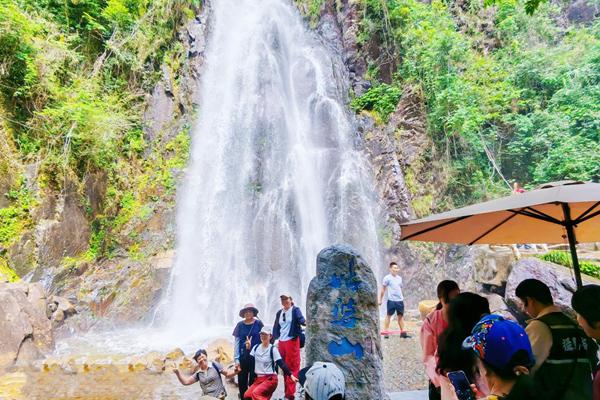 游客在姑婆山景区内仙姑瀑布景点游玩打卡。黄庆健摄