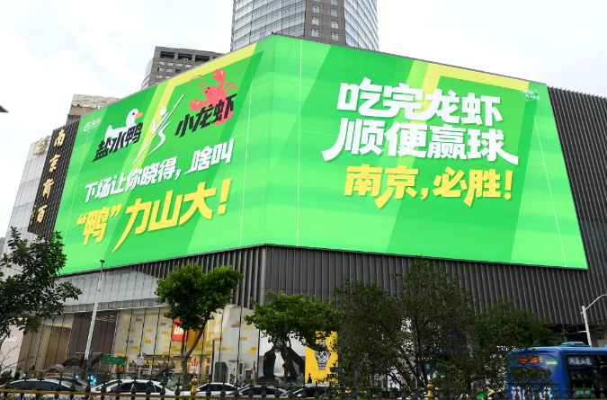 ▲2025年6月13日,江苏南京,苏超联赛淮安队与南京队比赛前,户外大屏广告推出支持南京队的花样梗。图/IC photo
