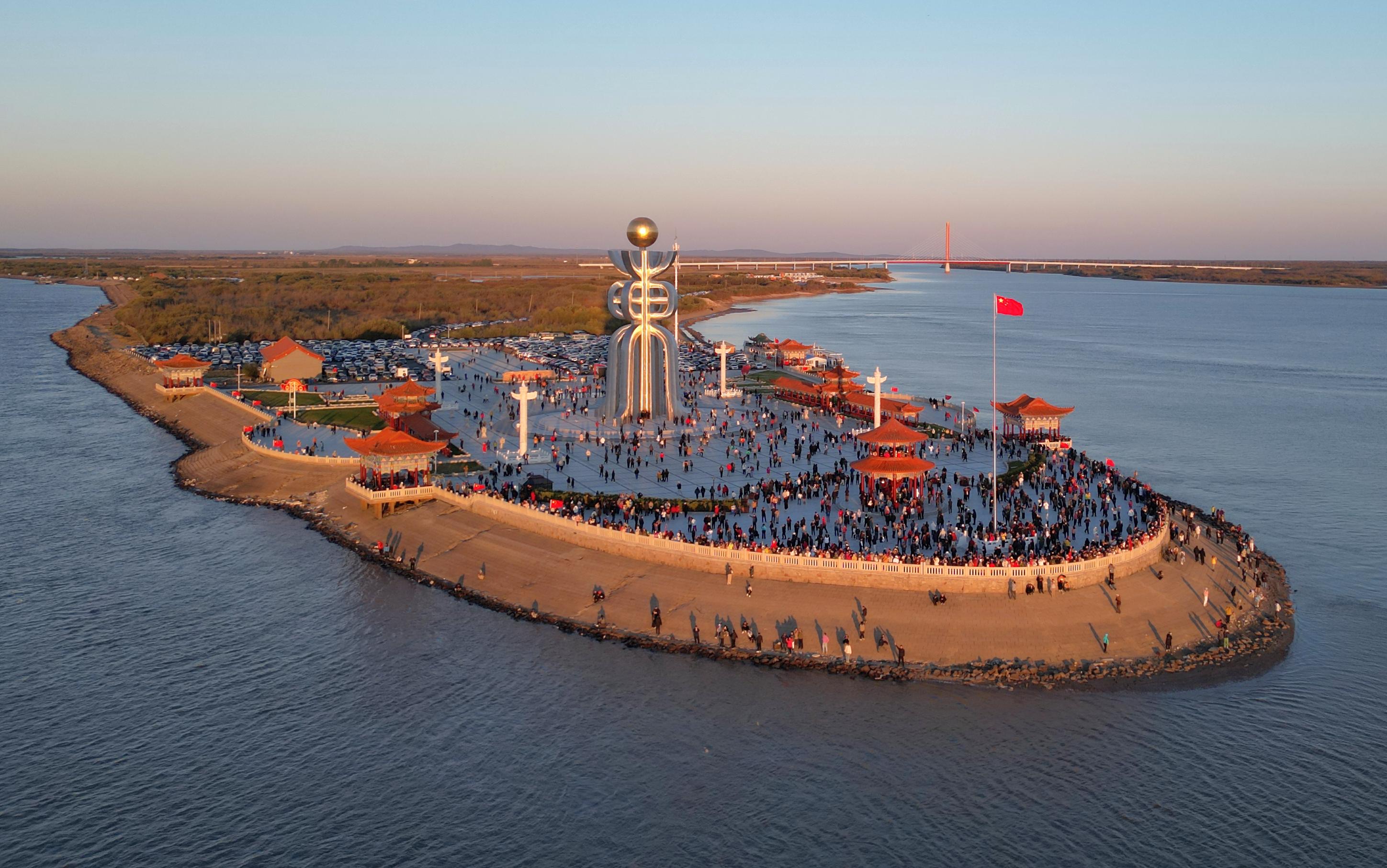 在黑龙江省抚远市的东极广场,游客在观看日出。新华社发(李拥军摄)
