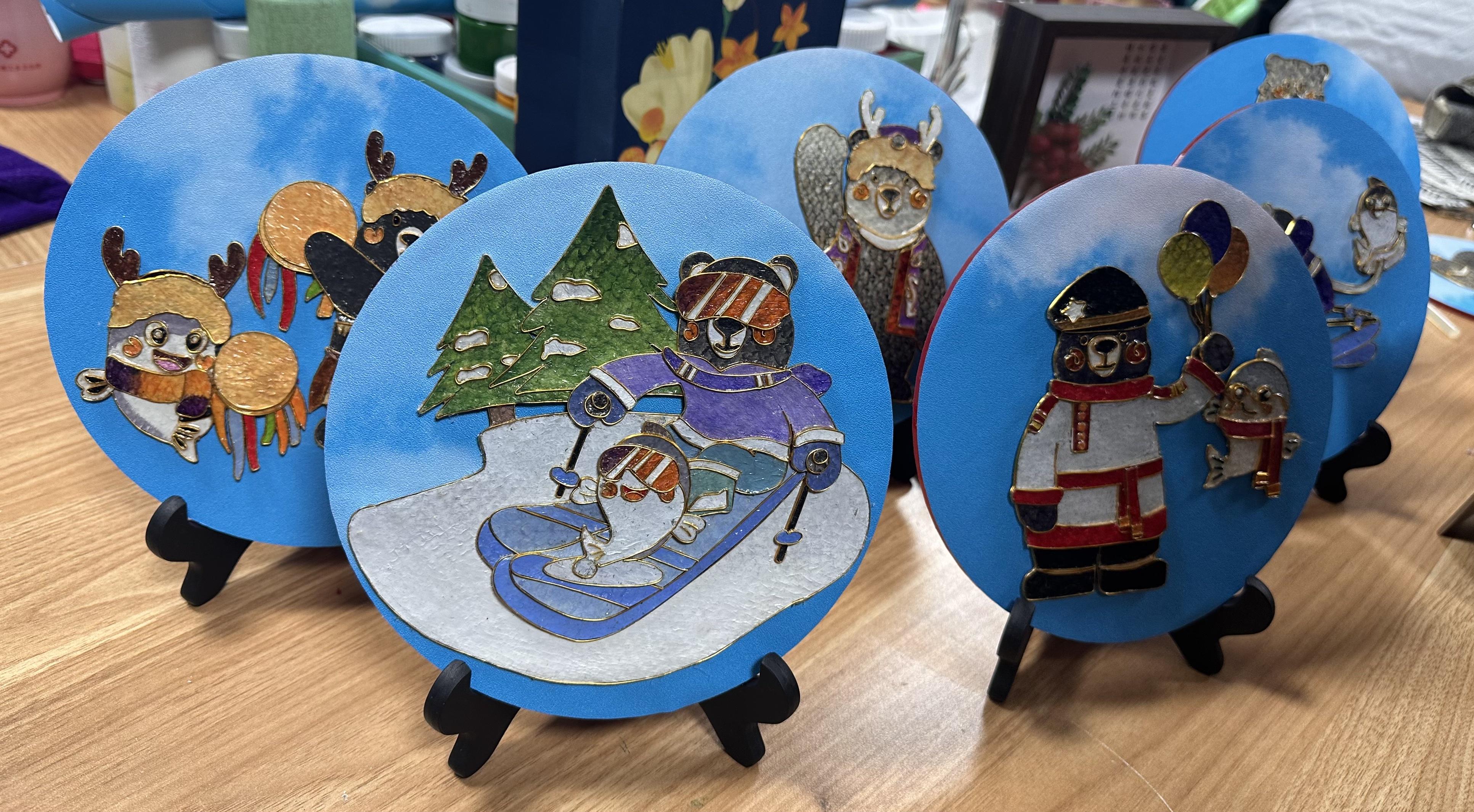 王桂荣和学员制作的鱼皮画摆件。新华社记者 戴锦镕 摄