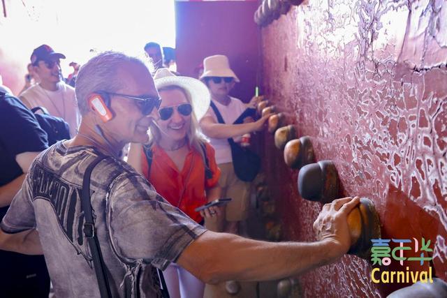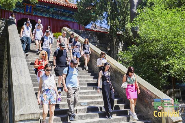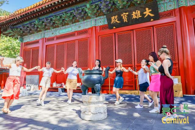 当行至大雄宝殿前,阳光透过飞檐斗拱洒下斑驳光影,艺术家们即兴合唱并跳起热情的舞蹈,引得围观游客纷纷用镜头记录下这跨越文明的欢乐瞬间。