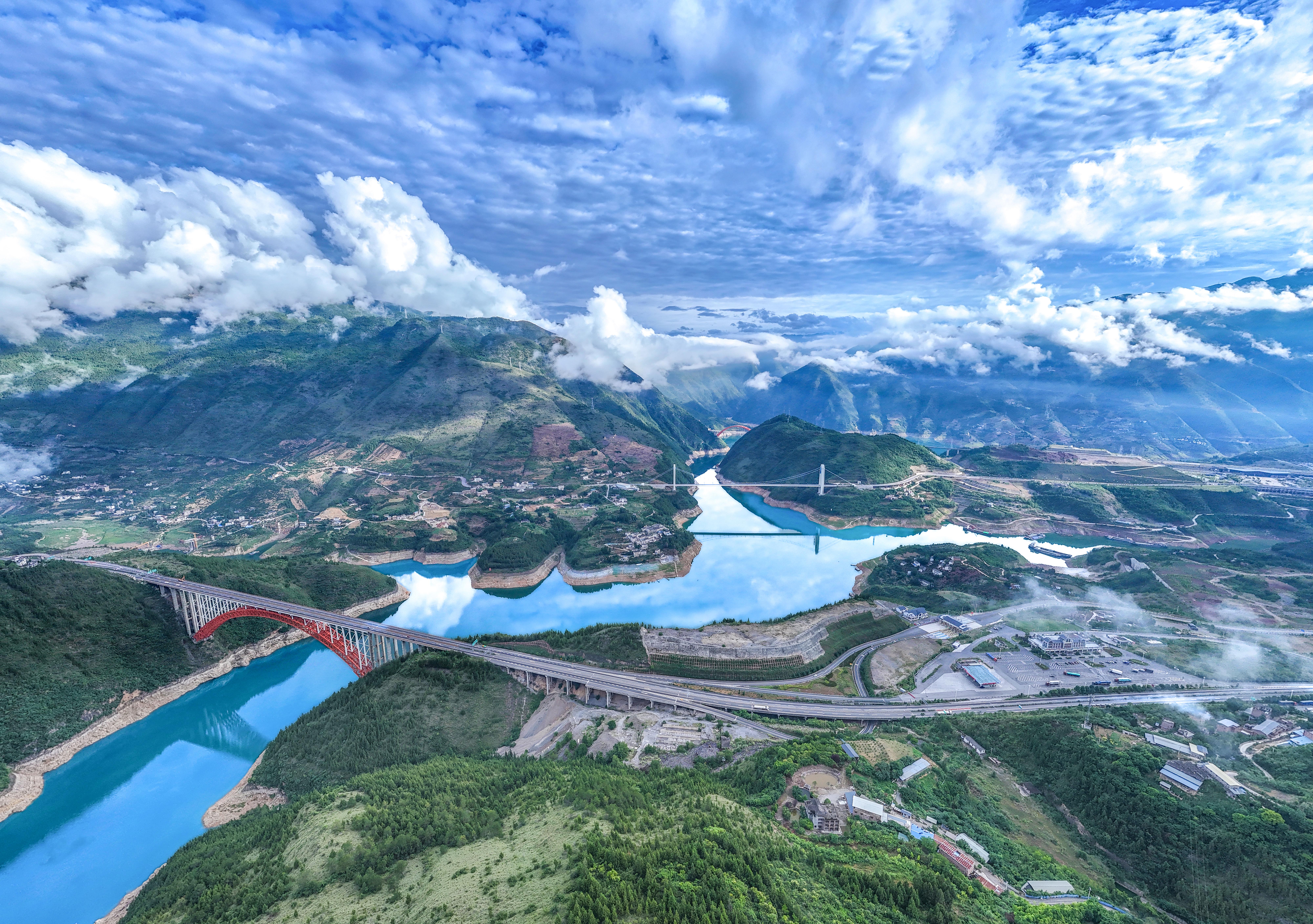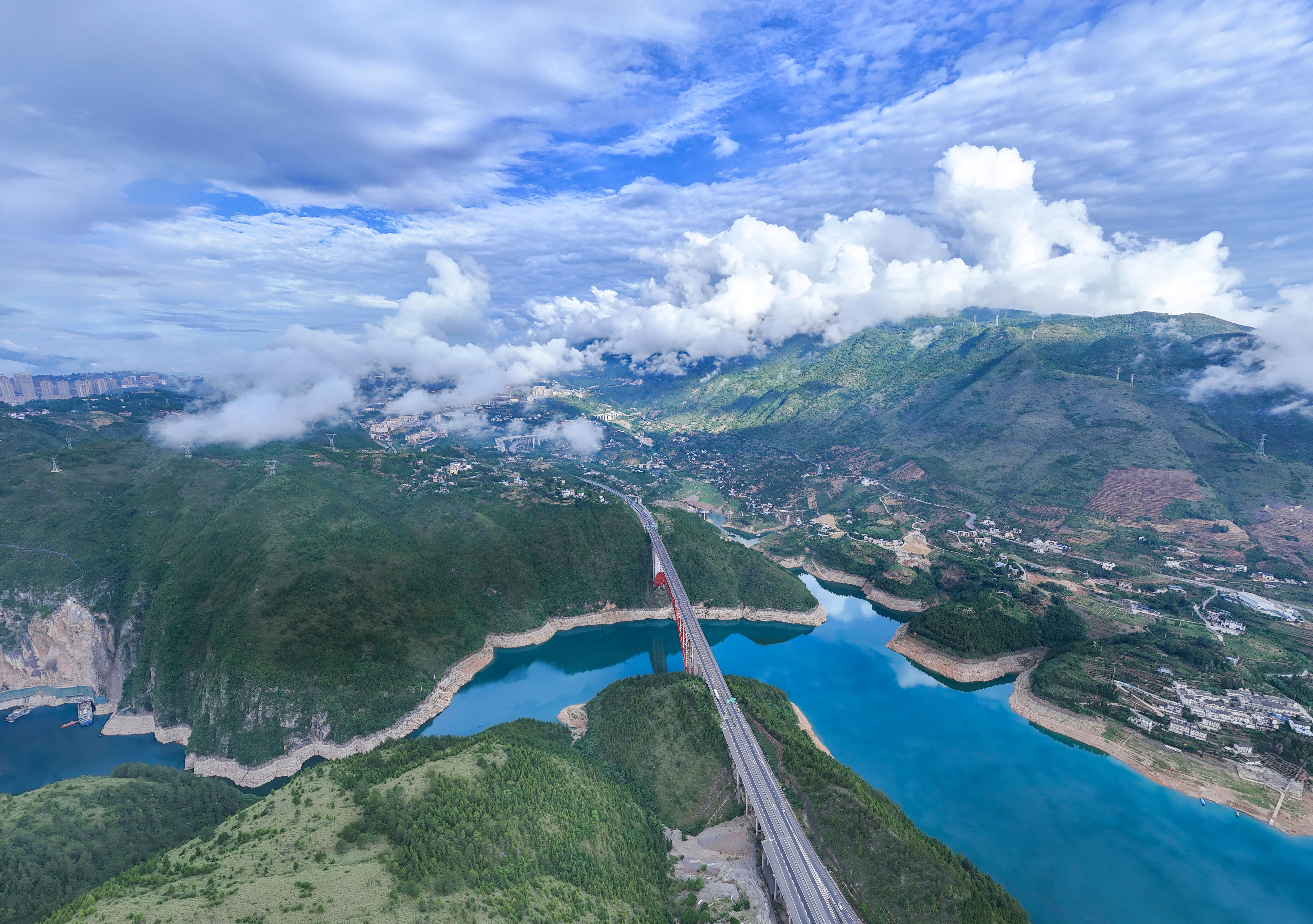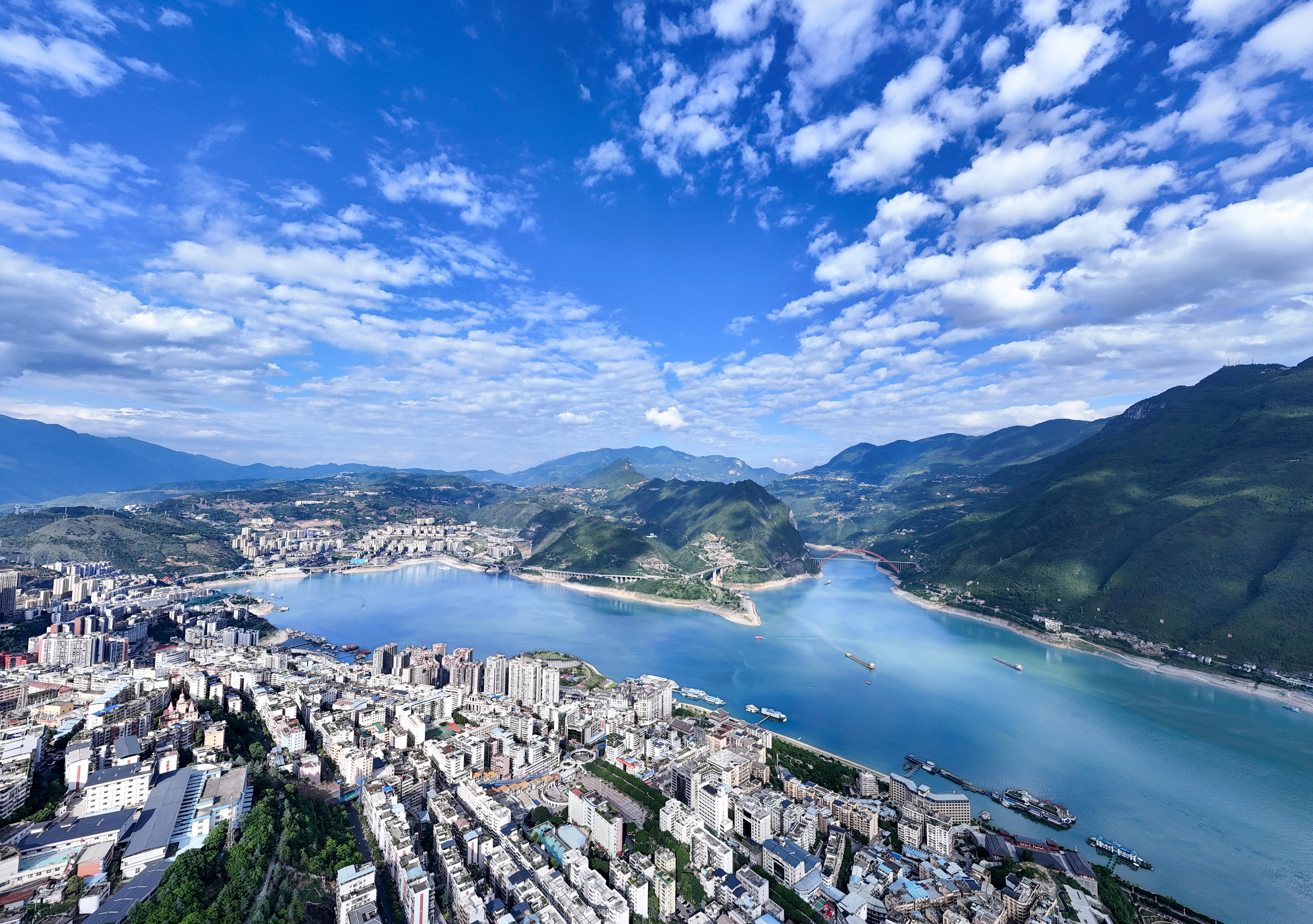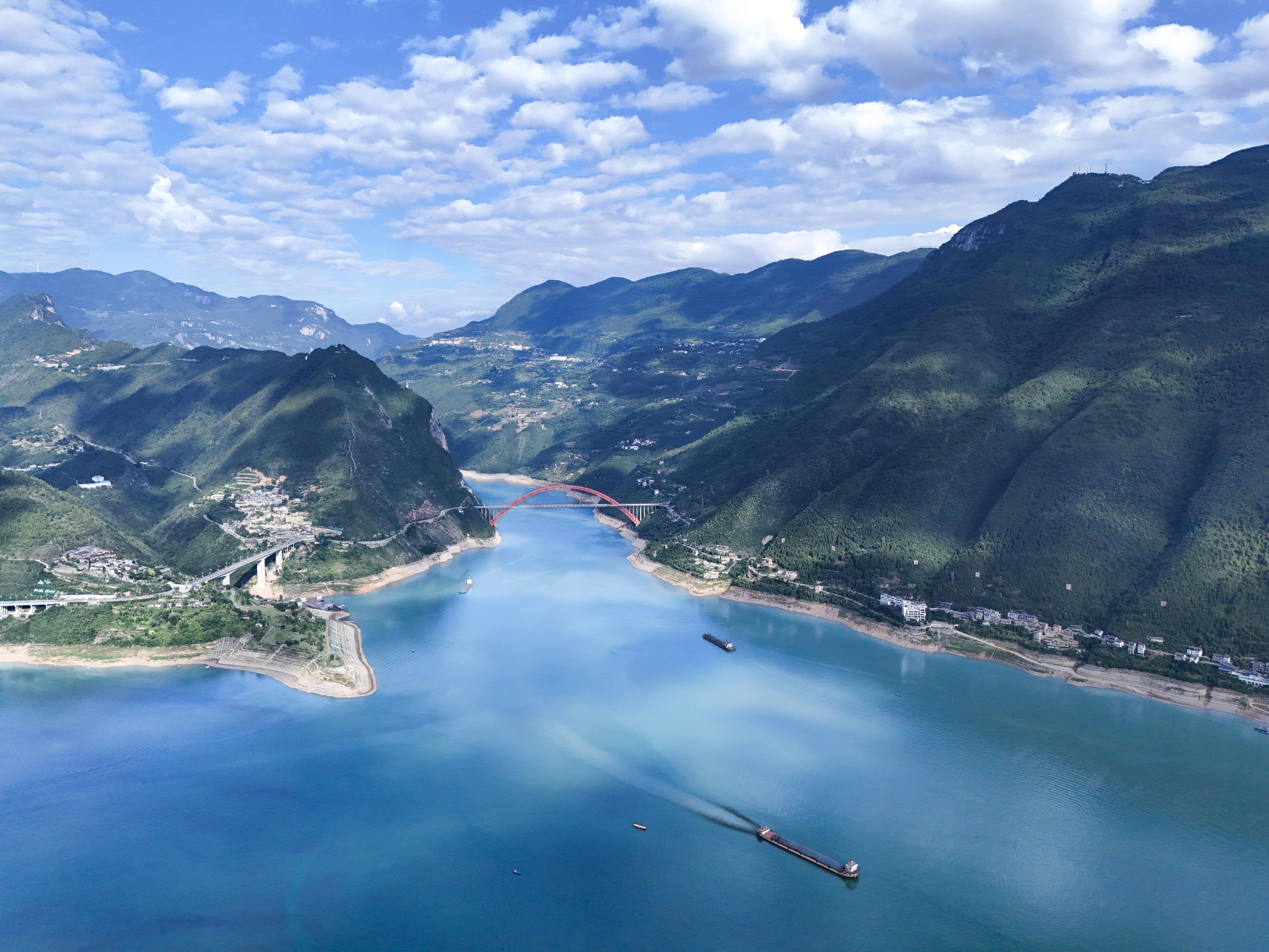 夏日的重庆市巫山县,山峡秀美,水清岸绿,河流与白云相互映衬,构成一幅美丽的山水生态画卷。