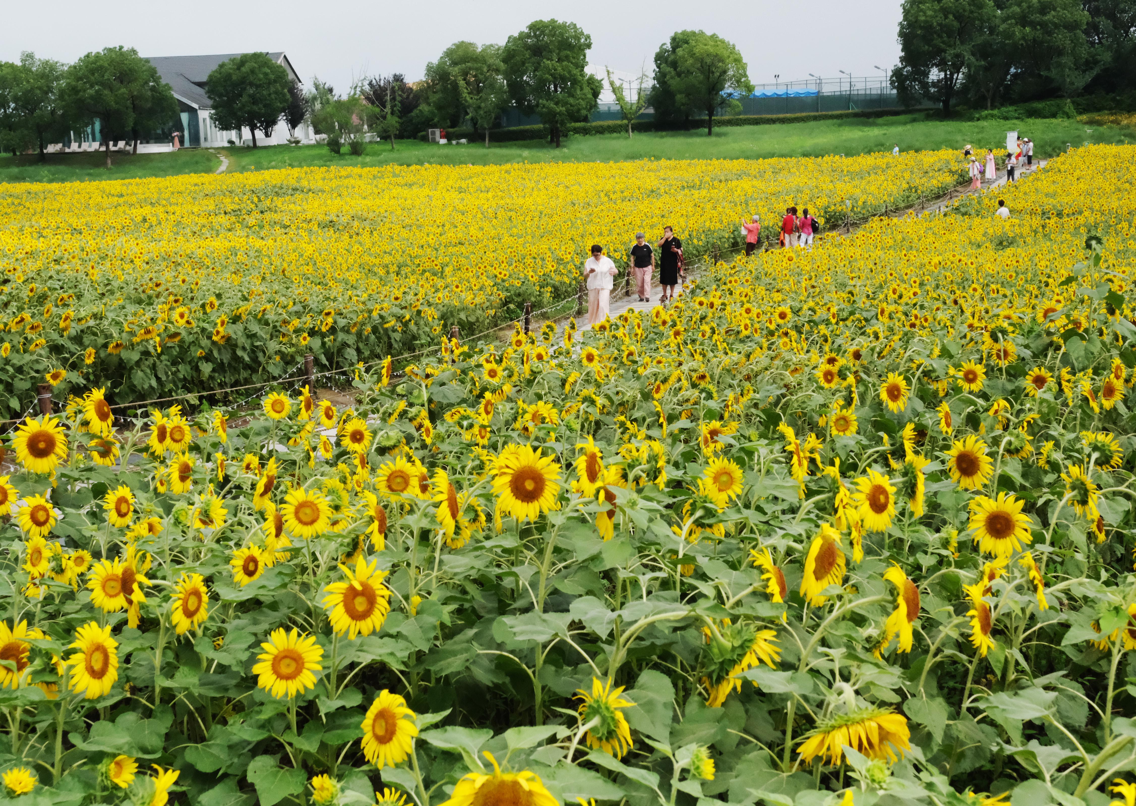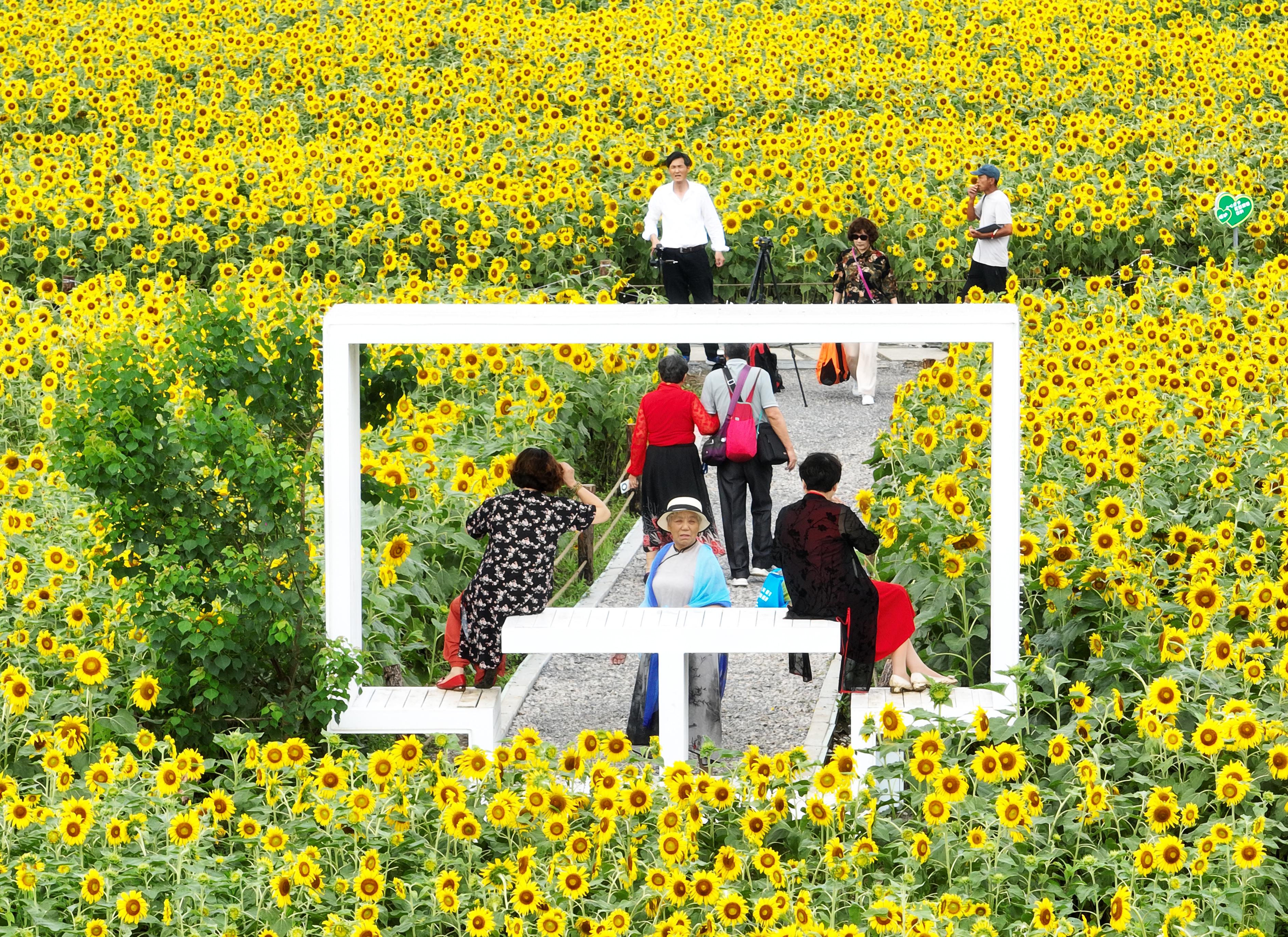 ↑2025年6月24日,游人徜徉在江苏省苏州市吴江区苏州湾体育公园的向日葵花海。(无人机照片)CICPHOTO/王建中 摄