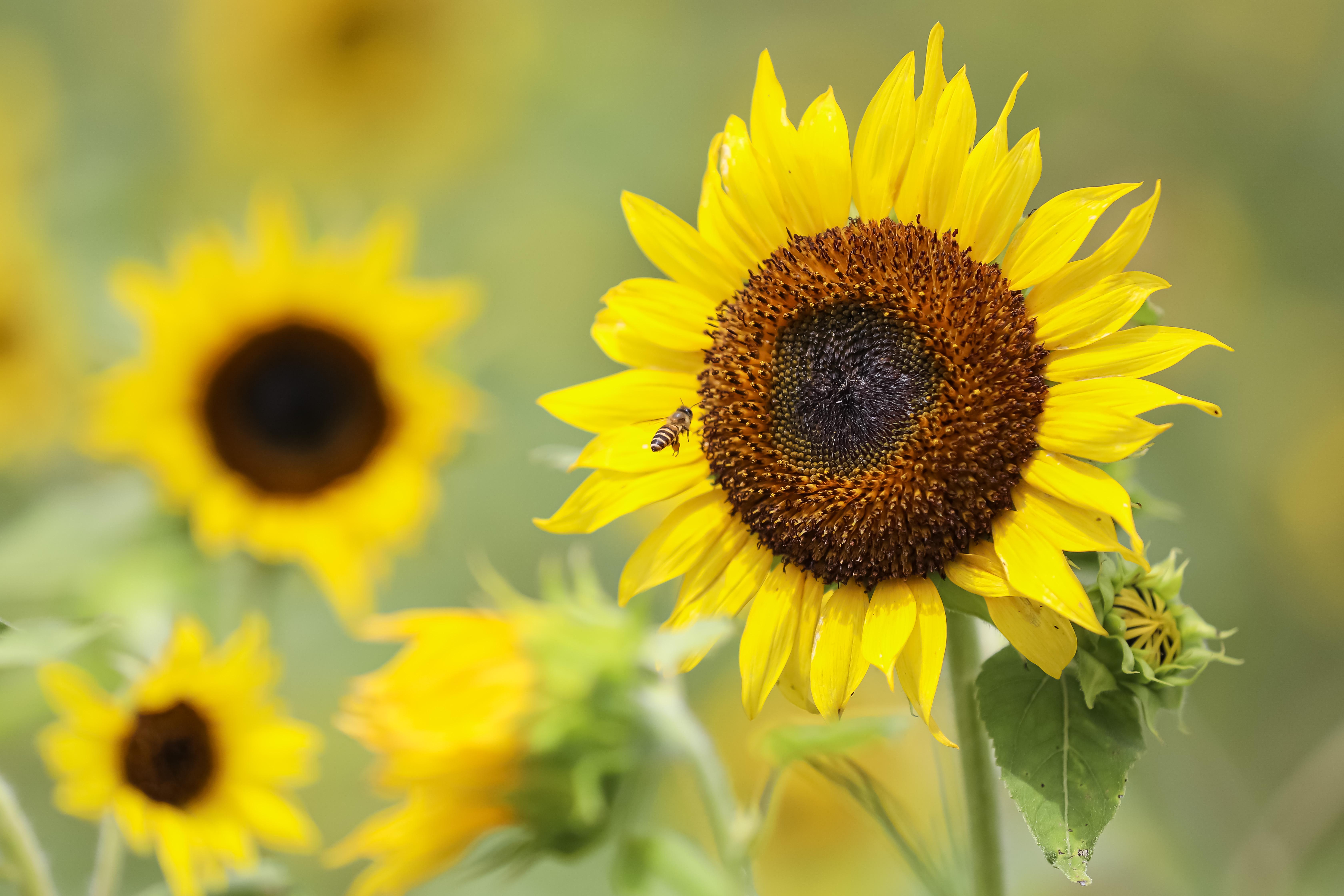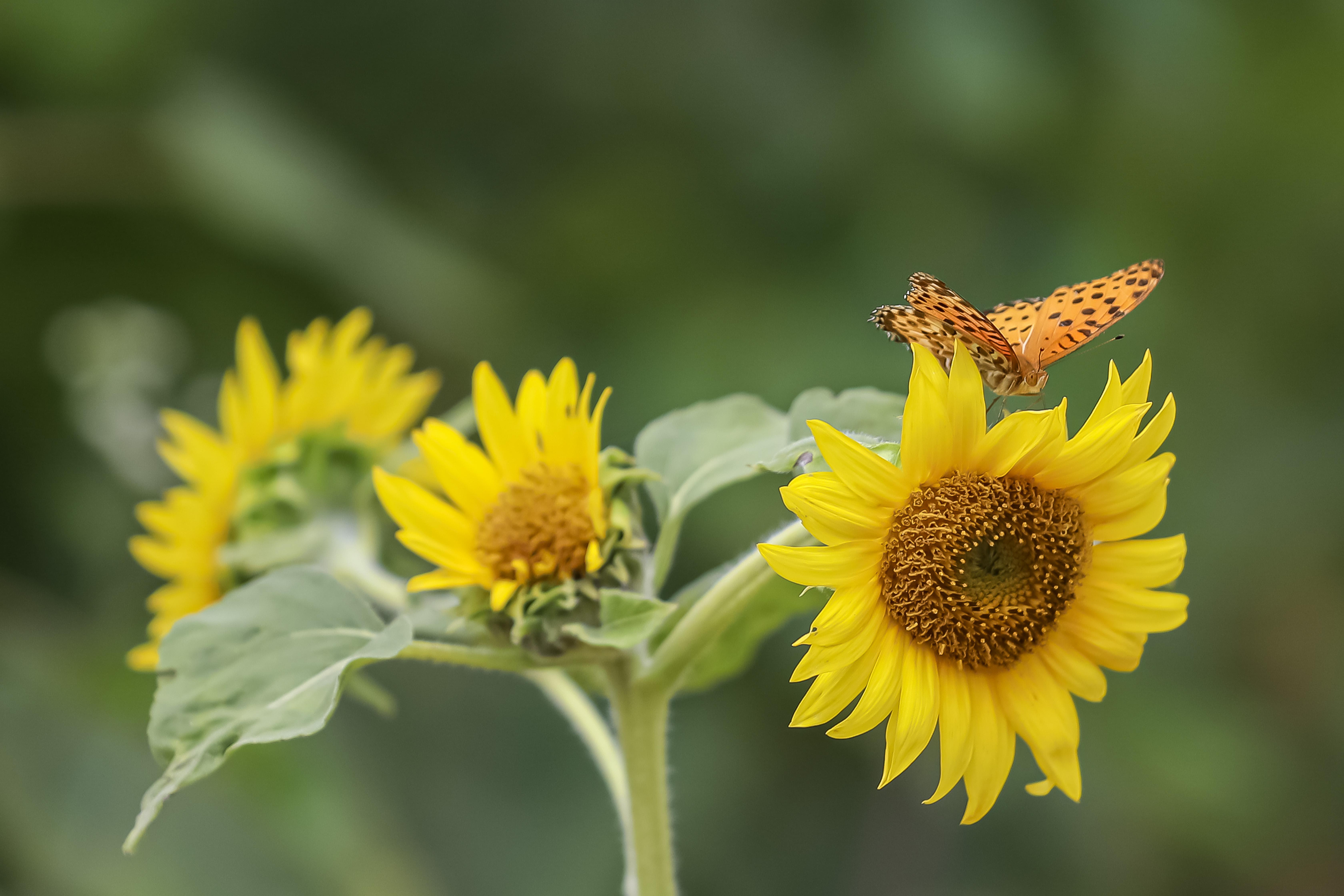 盛夏时节,各地的向日葵花在阳光下尽情绽放,蜜蜂、蝴蝶在花间飞舞,美丽的景色吸引游人驻足观赏。