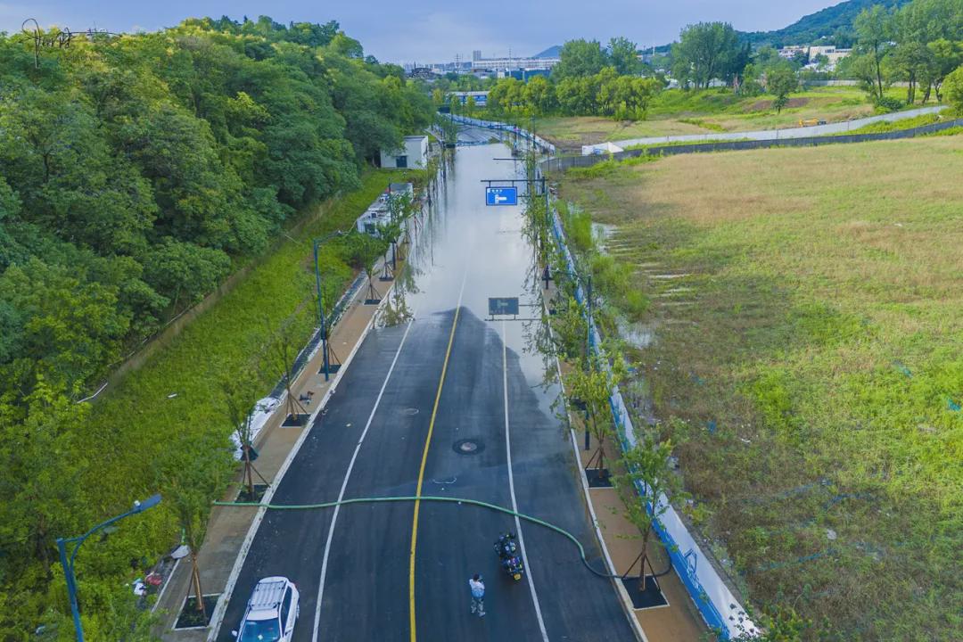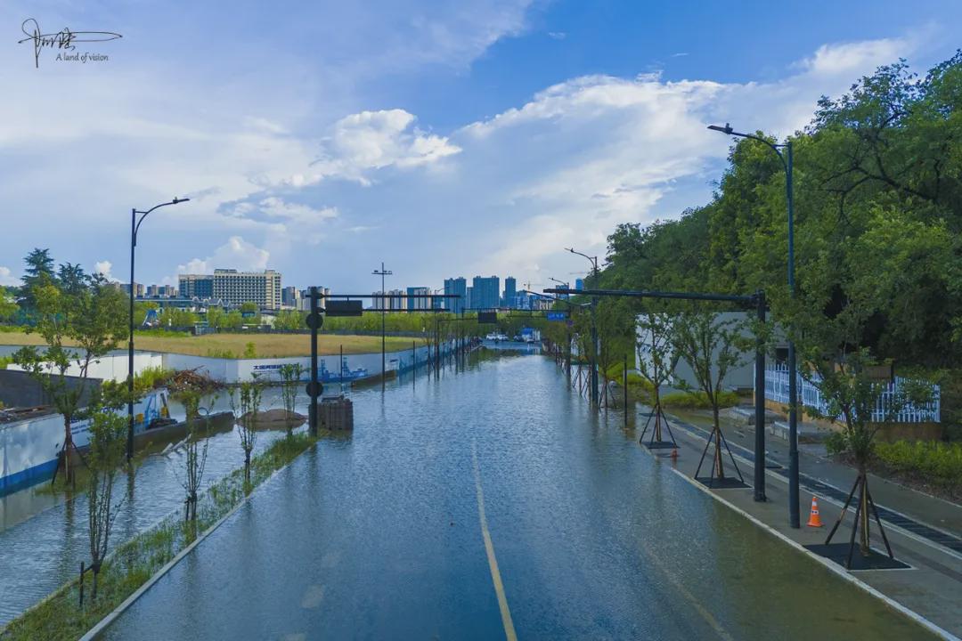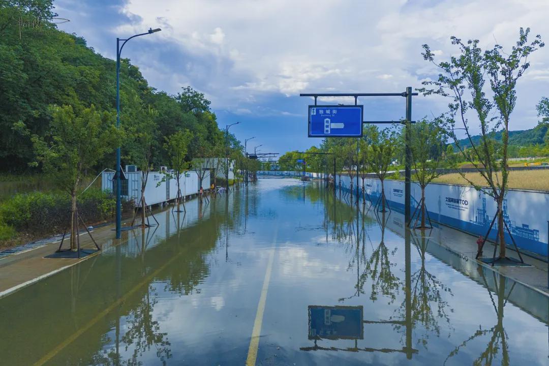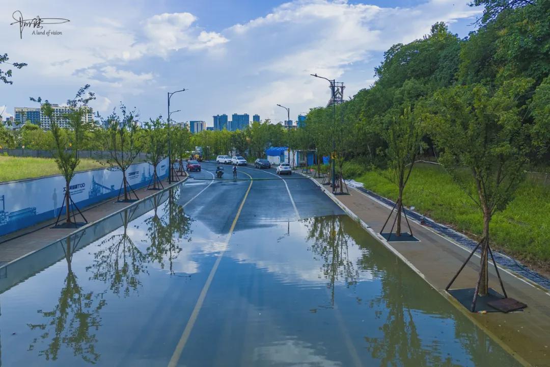 有趣的是注意到山前的马路却有积水汇聚成一片“汪洋”,偶尔有工人经过这里,还会特意跑到里面洗洗套鞋。定睛一看,原来这里是“瑕钢路”,未来会跟前方的“独城街”相交,从眼前的现状来看,显然排水系统还没建设完成。