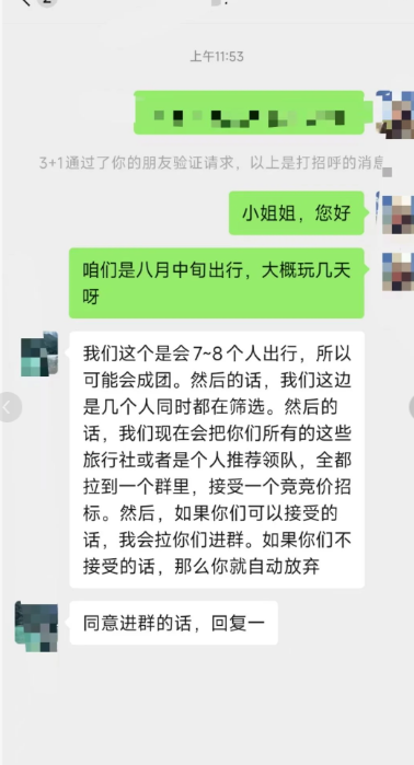 再往前一步看,这些旅行社在被拉进群前,可能刚通过好友,对方就毫不掩饰自己的意图,要求进群接受同行的竞价招标。没有多余的语言,动作 及其 熟练。