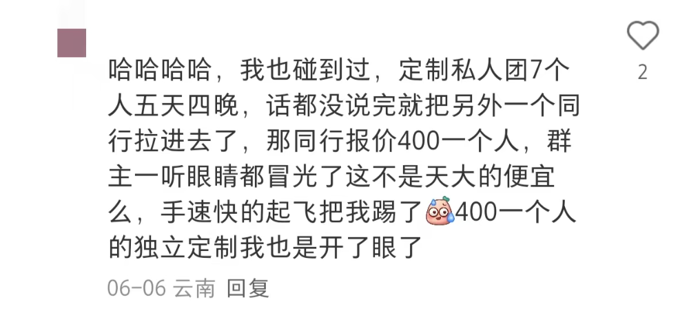 我也碰到过,定制私人团7人五天四晚,话都没说完就把另一个同行拉进去了,那同行报价400一个人,群主一听眼睛都冒光了,手速快得飞起,直接就把我踢了。