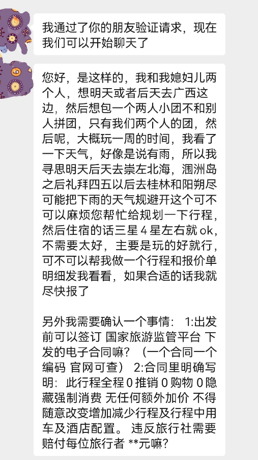 甚至有旅行社经历了不止一次这样的情况,并怒言这些客户可以比价,我们也知道肯定有人抢,但把所有人拉群招标,把我们当什么啦?