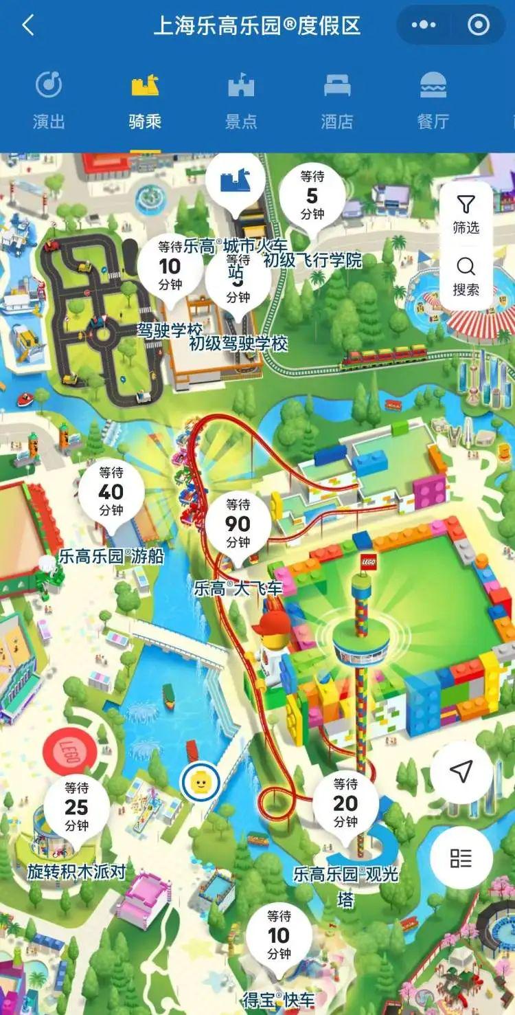 记者注意到,此前在试运营期间,“乐高乐园游船”、“观光塔”等热门项目排队时间往往超过40分钟,开园首日的排队时间却大多在30分钟以内。然而,作为乐园招牌项目之一的“乐高大飞车”排队时间却格外久。记者10点多抵达时,排队约75分钟才成功游玩。此时再重新排队,工作人员表示需要超90分钟。不过,下午1点15分左右,记者再次来到这里,此时排队仅需10分钟,因此建议错峰游玩热门项目。