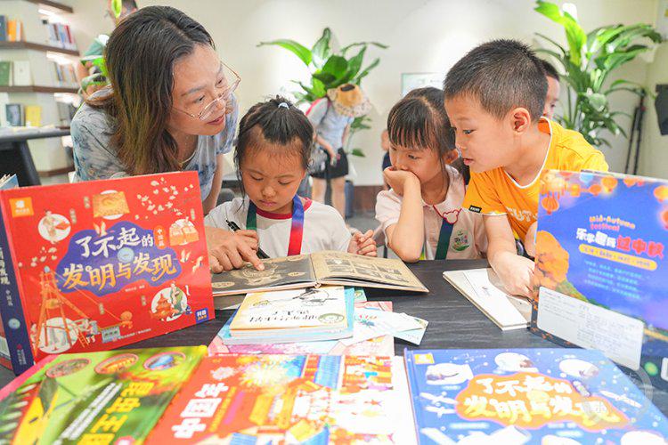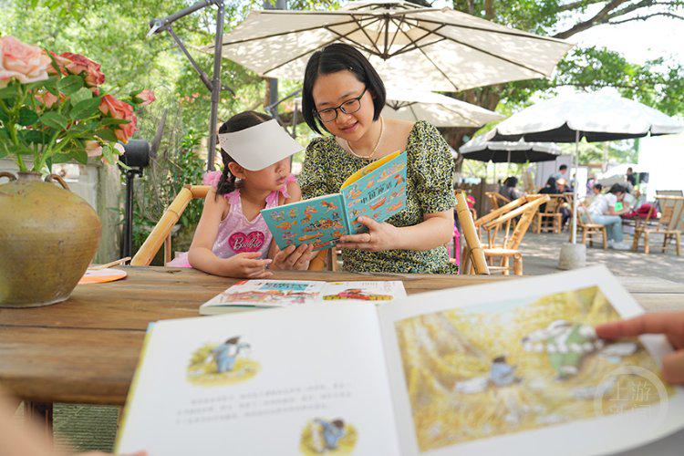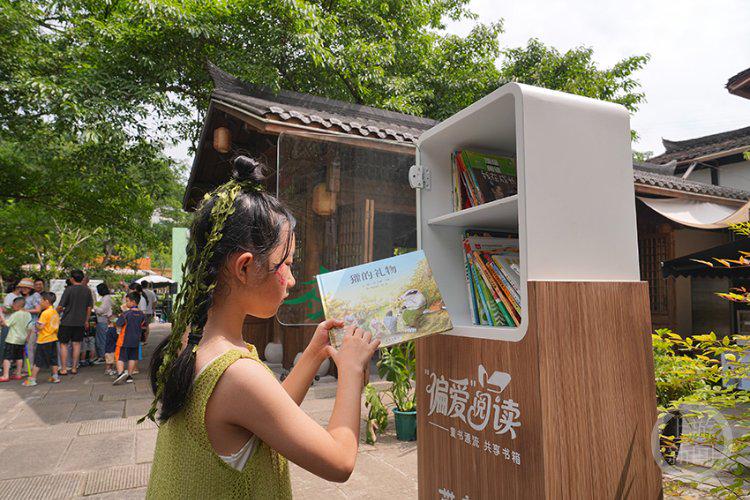在偏岩古镇童书漂流驿站,家长和孩子们一起阅读喜爱的书籍。