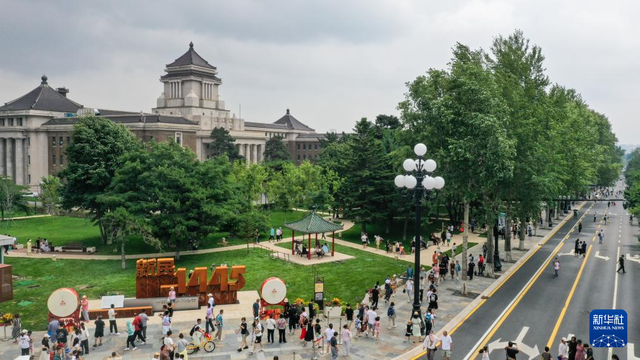 7月5日,游客在长春历史文化博物馆前观看表演(无人机照片)。