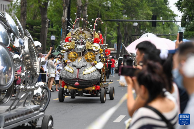 7月5日,艺术花车在新民大街上巡游。