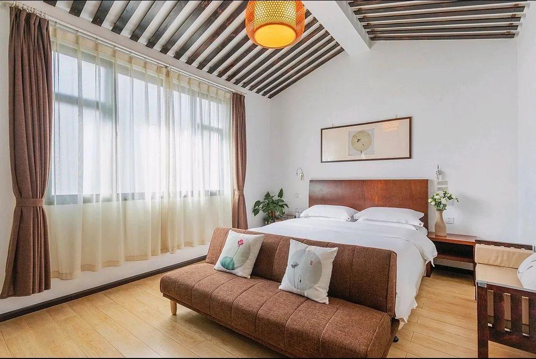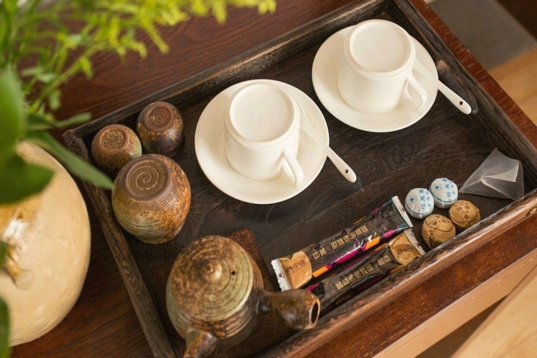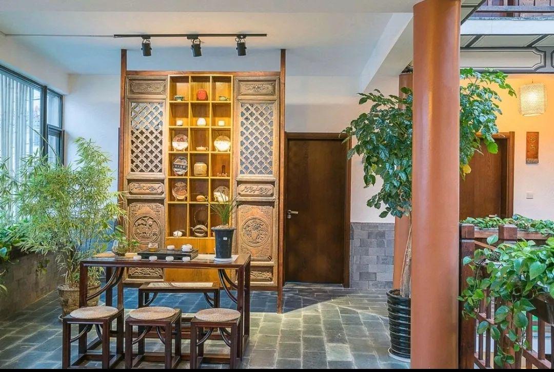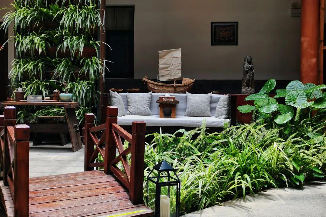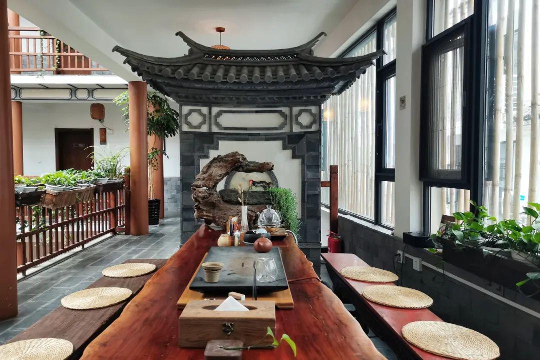 庭院中央青石茶台配竹影长椅,博古收藏、古老木门屏风尽显传统风情;二楼垂瀑绿萝掩映门扉,枯山水意境暗合“心注一境”的禅思,饮茶区可品云南普洱,阳光观景台让身心与云海共呼吸……客栈以“茶”为主题,天井小桥流水取韵江南,而厚重木梁又透出沉稳大气,成就了“推窗见苍山,闭户听松涛”的美学画卷。