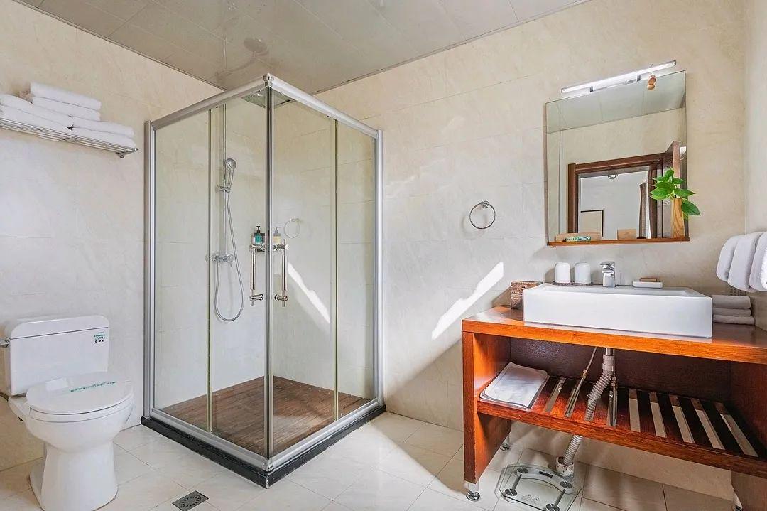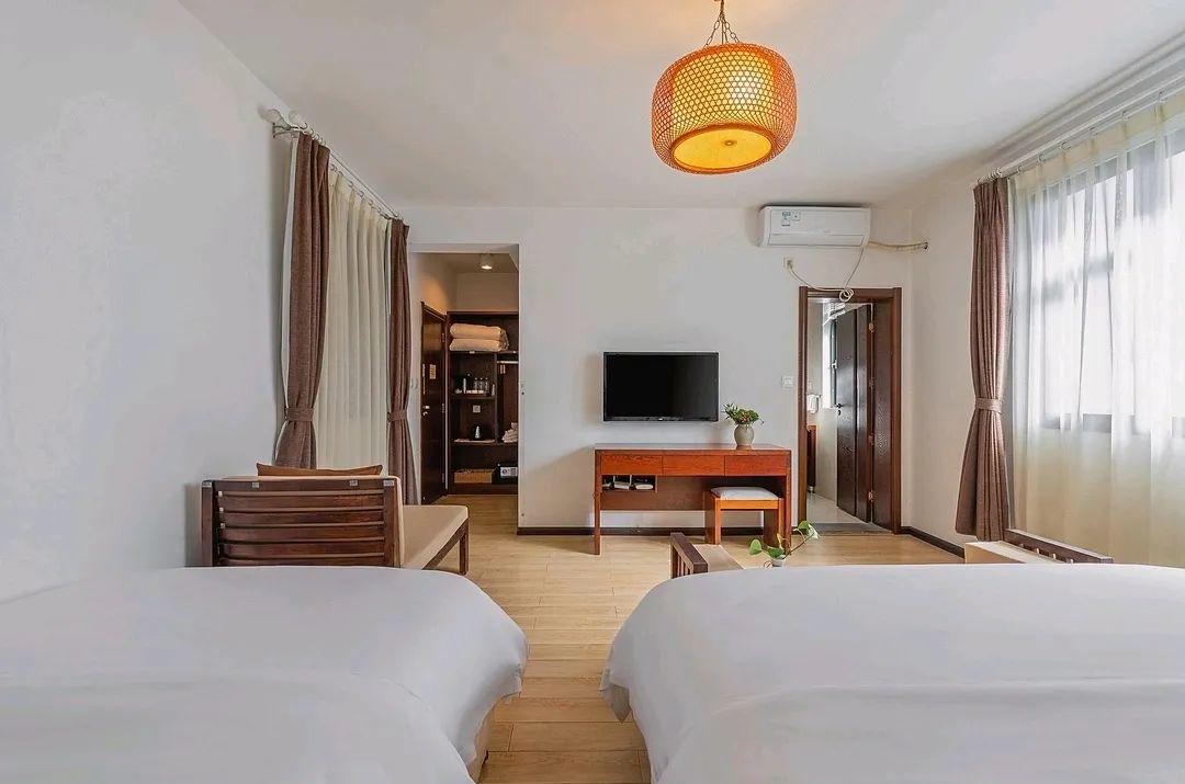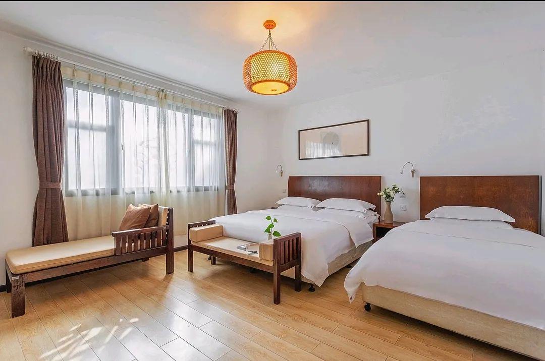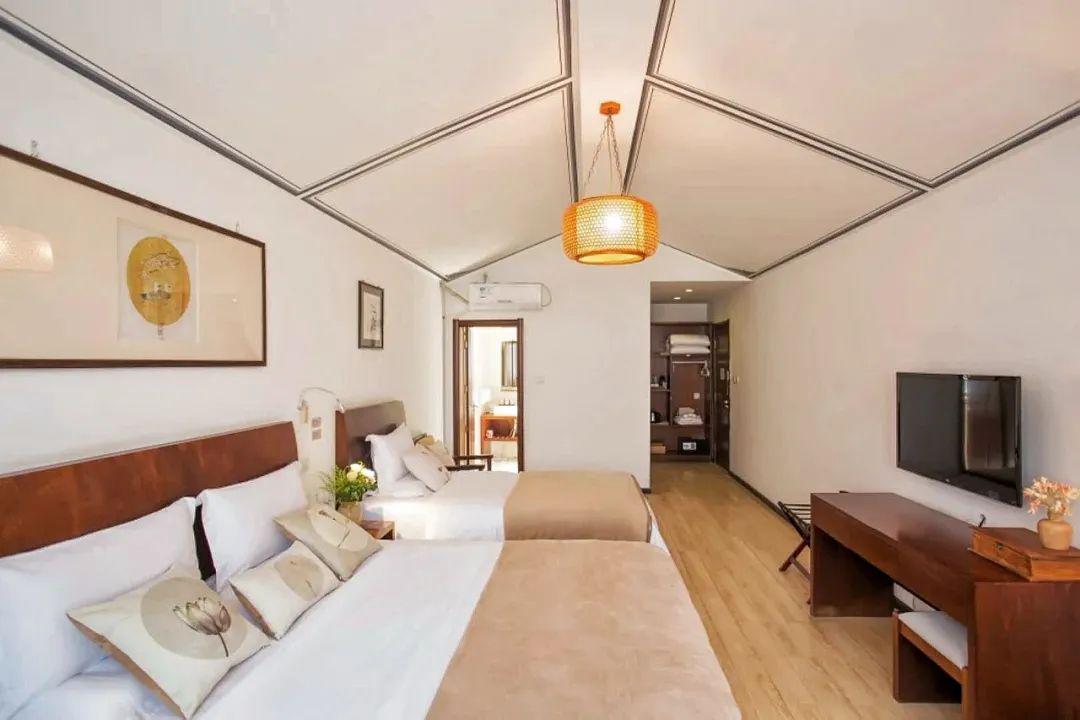 晏清山居的客房,以二十四节气为灵感命名,将自然时序与空间美学融合。客房室内设计遵循“简于形,雅于魂”的理念,摒弃繁复雕饰,以天然原木、素色棉麻奠定宁静基调。客房门前设绿植景观,或一丛修竹伴石,或几株山茶映墙。往门前休憩长椅一坐,雅致惬意之感顿生。
