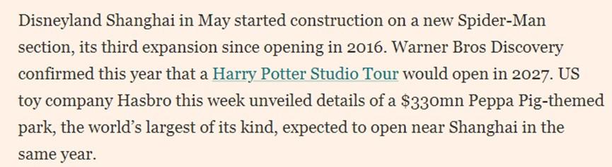 报道说,经过过去十几年快速扩张,中国主题公园产业规模跃居全球第二,仅次于美国。目前,国际企业仍持续在华布局主题娱乐产业:上海迪士尼乐园于五月启动全新的蜘蛛侠主题园区建设,这也是2016年开园以来的第三次扩建;华纳兄弟探索公司今年确认将于2027年开放"哈利波特制片厂之旅";美国玩具巨头孩之宝也公布,将斥资3.3亿美元(约合人民币22.7亿元)打造全球最大规模的小猪佩奇主题公园,计划同年落户上海。这一系列新项目密集推出,反映出业界对中国市场增长的强烈期待。