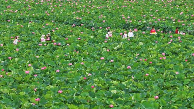 游人徜徉其间,或驻足赏景,或拍照留念,沉醉于这片夏日限定的荷海风光之中。