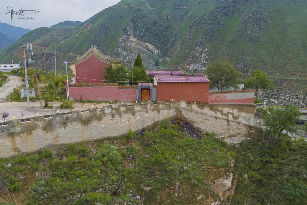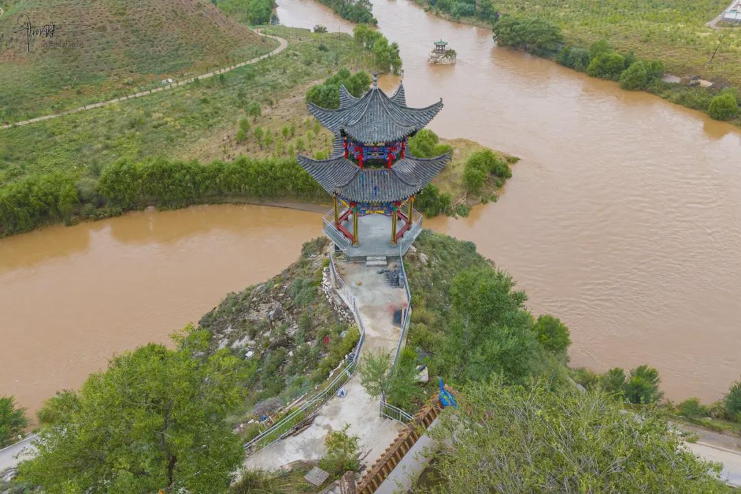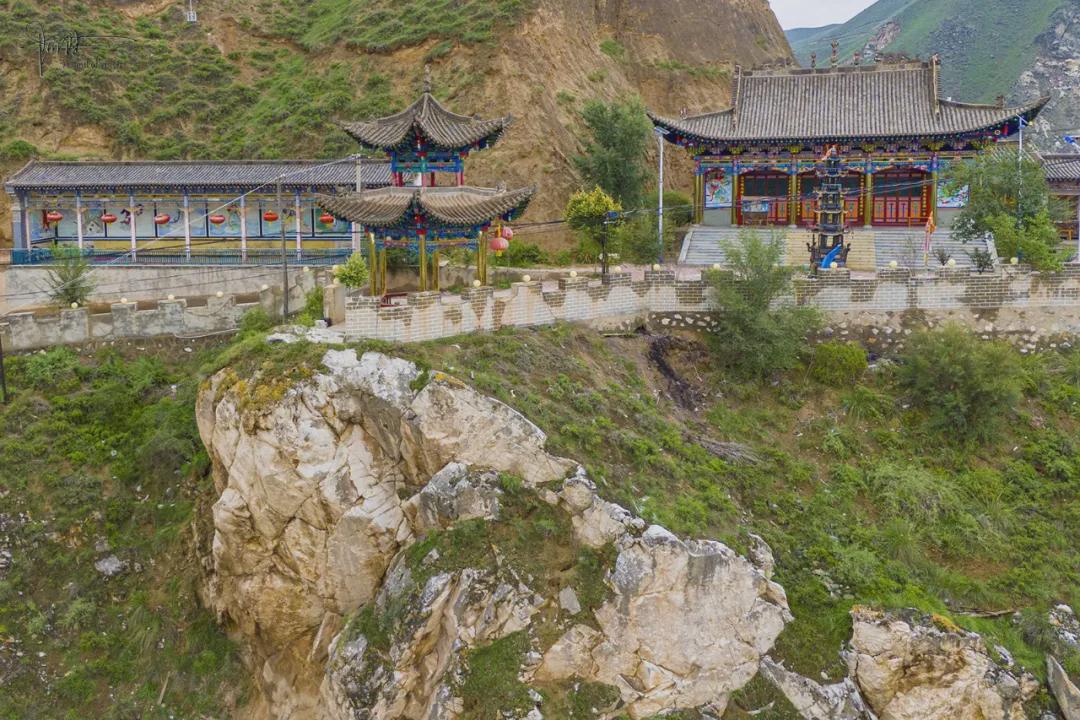 金山寺不仅依山而建,还特别在地势最突兀处修建了一座六角亭,居高临下可谓视野绝佳,正好能俯瞰湟水河、前方的鲁班亭以及周边村镇的全景。