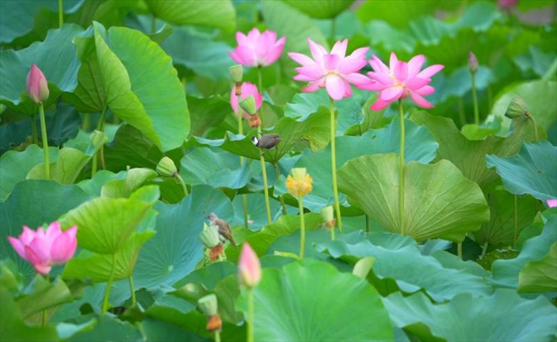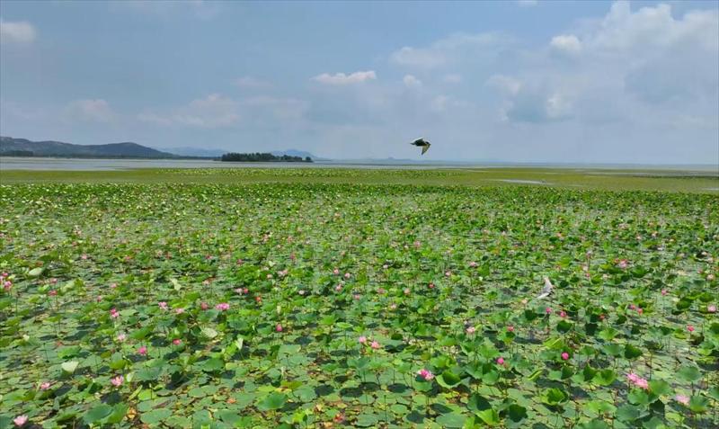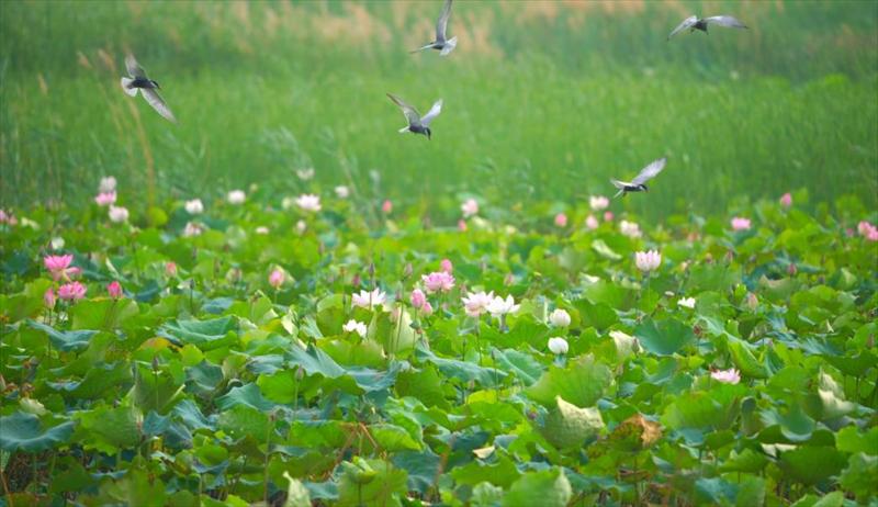 在不远处的湿地,数十只须浮鸥盘旋飞舞,它们身姿轻盈,时而俯冲掠过水面,时而展翅飞向高空,为这幅静谧的荷花图增添了灵动的气息。碧水、翠叶、粉荷、飞鸟,共同奏响了夏日的交响曲。