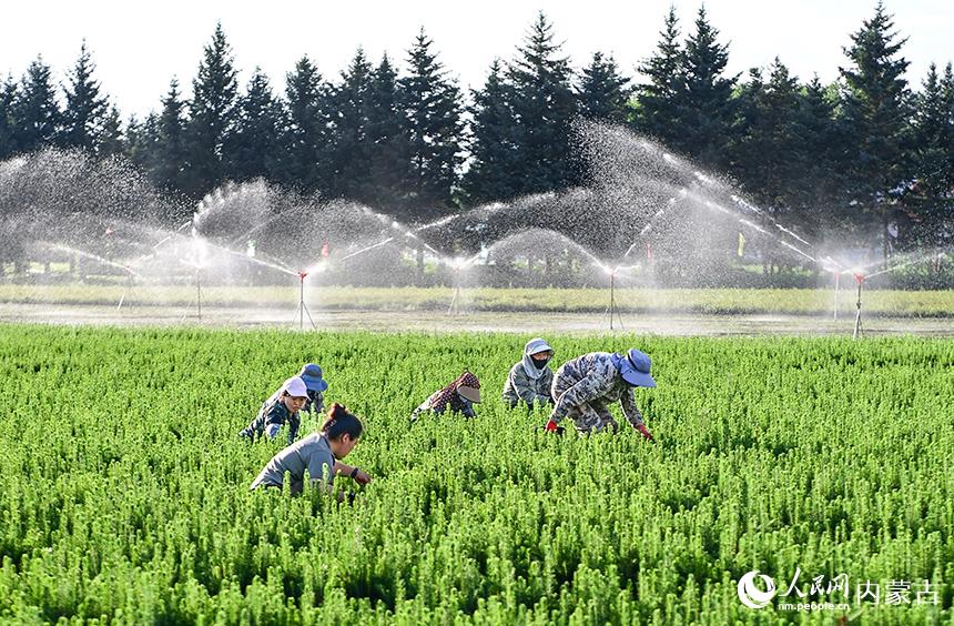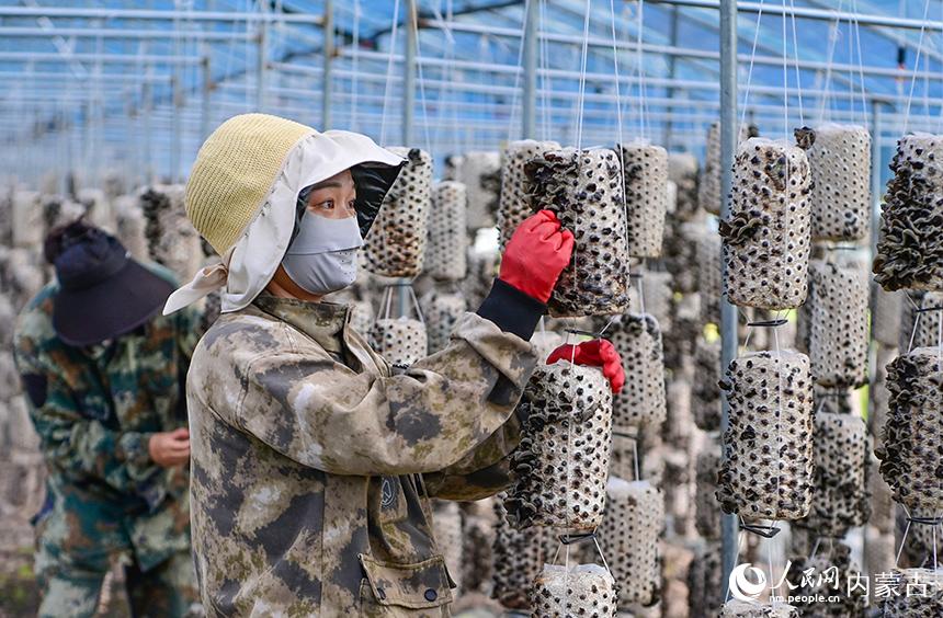 工人在牙克石林场食用菌基地采摘木耳。王正摄