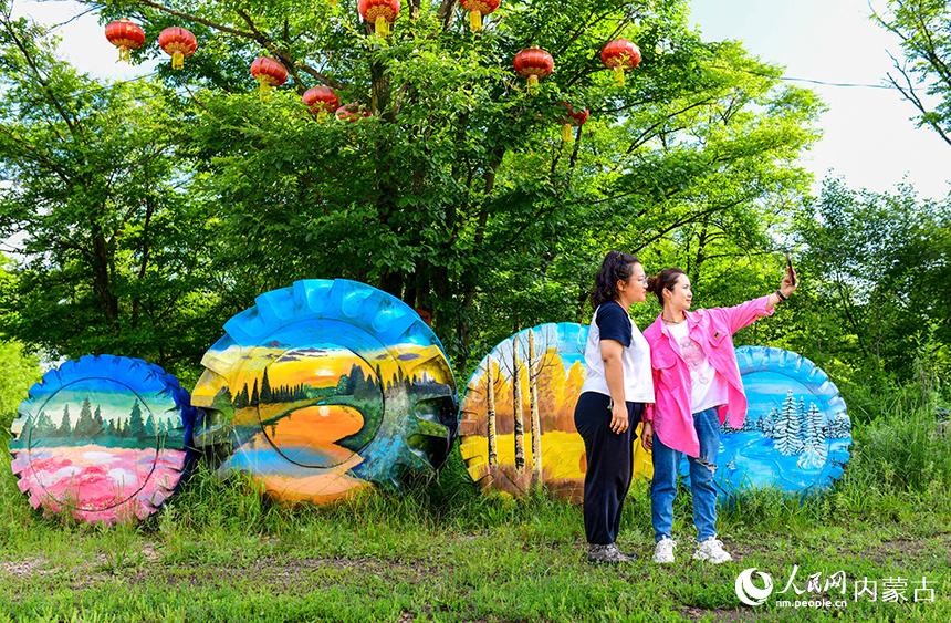 游客在牙克石林场森林康养步道里拍照。王正摄