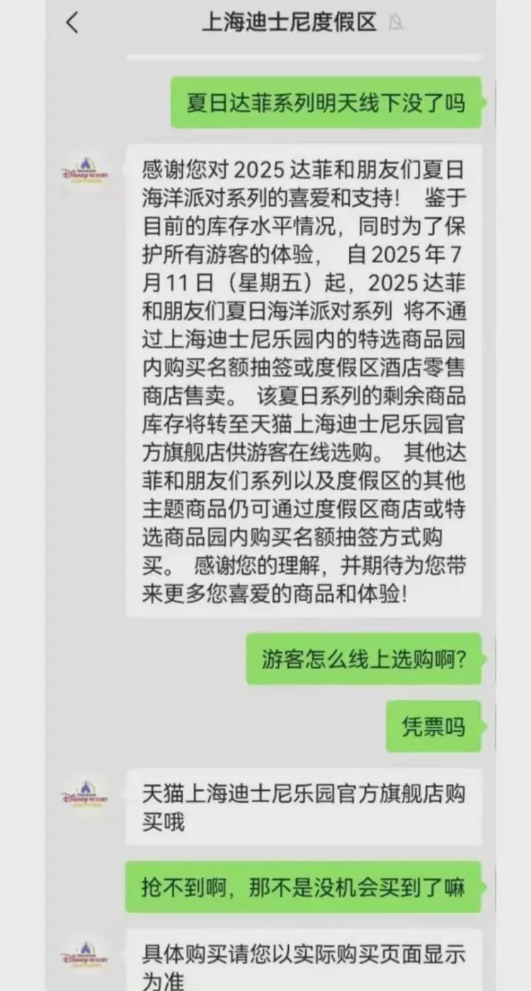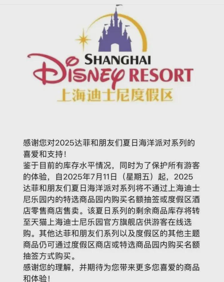 “鉴于目前的库存水平情况,同时为了保护所有游客的体验,自2025年7月11日(星期五)起,2025达菲和朋友们夏日海洋派对系列将不通过上海迪士尼乐园内的特选商品园内购买名额抽签或度假区酒店零售商店售卖。该夏日系列的剩余商品库存将转至天猫上海迪士尼乐园官方旗舰店供游客在线选购。”