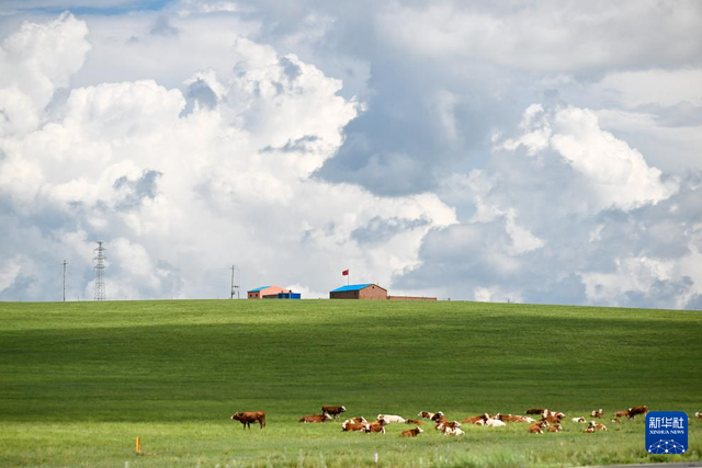 7月10日拍摄的内蒙古锡林郭勒盟东乌珠穆沁旗草原上的牛群。