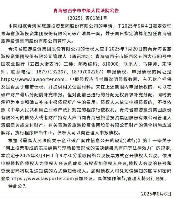 目前,青海旅投及其13家子公司已进入破产清算程序,法院要求相关债权人在2025年7月20日前向管理人申报债权,并定于8月4日上午9点30分采取网络会议投票方式召开债权人会议。