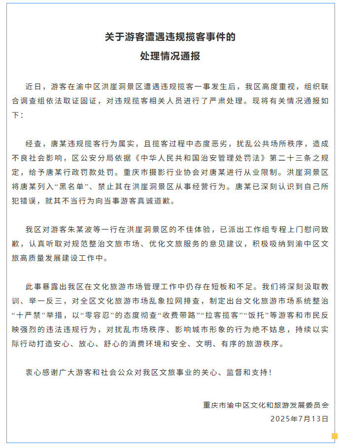 今天,重庆市渝中区文化和旅游发展委员会发布关于游客遭遇违规揽客事件的处理情况通报,全文如下:
