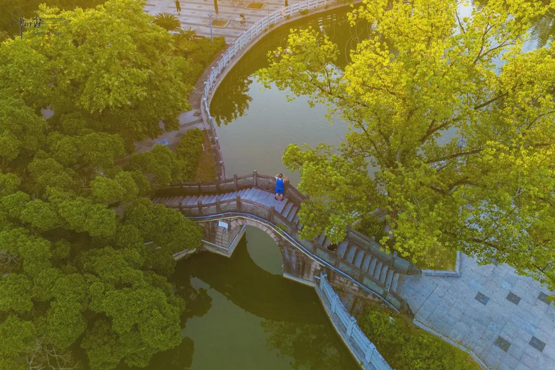 航拍一圈,最多只发现七、八道身影,其中有一位还在拱桥的正中间高举手机一动不动,面向东方站了很久,如果没猜错的话,他应该是位摄影爱好者,正在拍“延时作品”。有趣的是直到我一块电池飞尽匆匆返航,这人还“杵”在那里,想必收获的“风起云涌日出”画面会十分壮观吧。