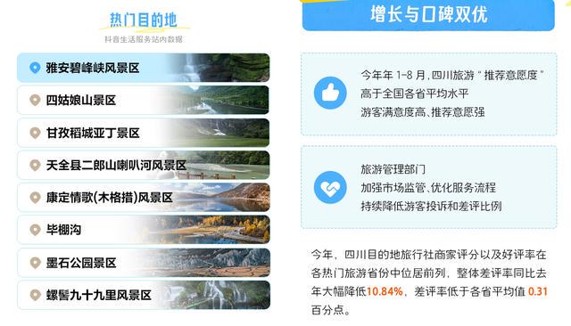 在规模增长同时,川西旅游口碑保持良好水平。《报告》显示,2025年1-8月,四川旅游“推荐意愿度”高于全国平均水平,旅游差评率同比降低10.84%。这得益于当地加强市场监管、优化服务流程等举措,如四姑娘山启动世界地质公园申创、九寨沟完善智慧景区系统等。