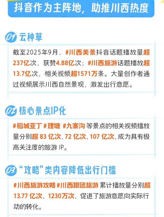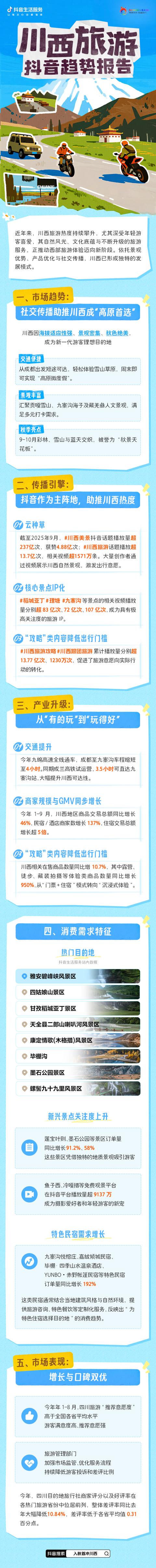 随着秋季营销活动的推进,叠加九绵高速、成兰高铁带来的交通便利,川西旅游面临新一轮发展机遇。抖音生活服务相关负责人表示,平台将持续发挥内容生态与产品技术优势,携手四川文旅部门,进一步开发川西的优势旅游资源,助力川西打造世界级旅游目的地,为游客带来更丰富、更深度的高原游玩体验。