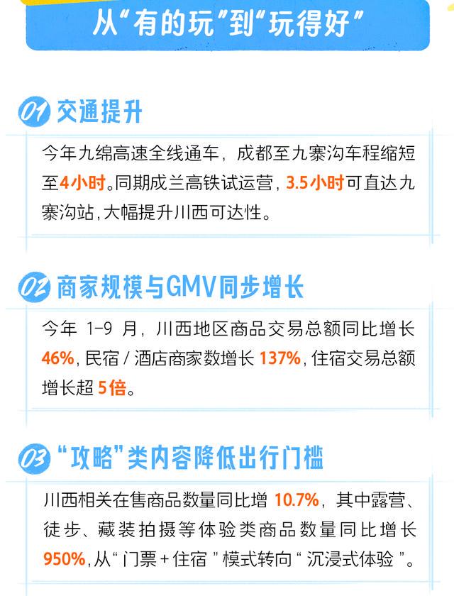 随着九绵高速全线通车,成都至九寨沟车程缩短至4小时;成兰高铁试运营实现3.5小时直达九寨沟站,“快进慢游”交通体系初步形成。交通条件改善直接带动产业规模扩大,抖音生活服务数据显示,1-9月川西地区商品交易总额同比增长47%,民宿/酒店商家数增长137%,住宿交易总额增长超5倍。