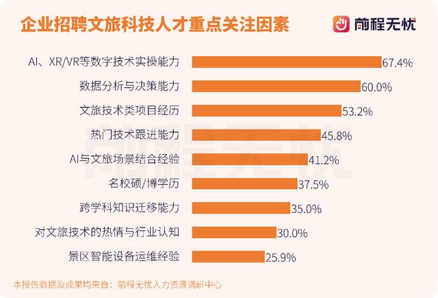 科技创新正成为文旅产业升级的核心驱动力,也重塑了人才招聘的核心指标,技术能力已从“加分项”变为“必备项”。前程无忧人力资源调研中心研究成果显示,头部企业在招聘中对于候选人对数字工具运用及场景落地能力日益重视,将AI、XR/VR等数字技术实操能力(67.4%)、数据分析与决策能力(60.0%)、文旅技术类项目经验(53.2%)等纳入核心考核指标。