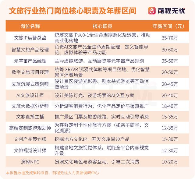 在文旅消费创新浪潮下,行业岗位体系持续升级,在技术融合、文化创意、运营拓展、灵活互动等领域,催生出一批兼具文化内涵与技术属性的热门职业。前程无忧专业薪酬报告显示:“文旅IP运营总监”“智慧文旅产品经理”“元宇宙产品经理”岗位凭借其跨领域整合能力,成为行业高薪代表,年薪区间为25-70万元。