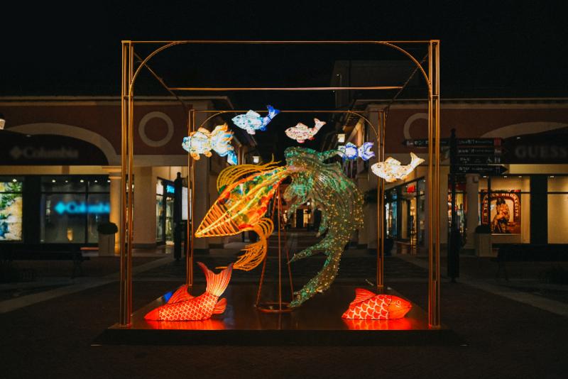 周年庆期间,五组以岭南传统民俗文化为展现主题的艺术装置,运用彩灯工艺,将中国文化中的“鱼跃龙门”等吉祥寓意,以及“百鲤呈祥”的灵动姿态生动呈现于意式建筑群落之间,带来意式优雅与在地文化相交融的独特沉浸式体验。此外,佛山市辰美(国际)艺术学校学生代表们创作的灯影作品也于现场陈展,年轻而充满想象力的表达,延续了传统灯艺的韵味。