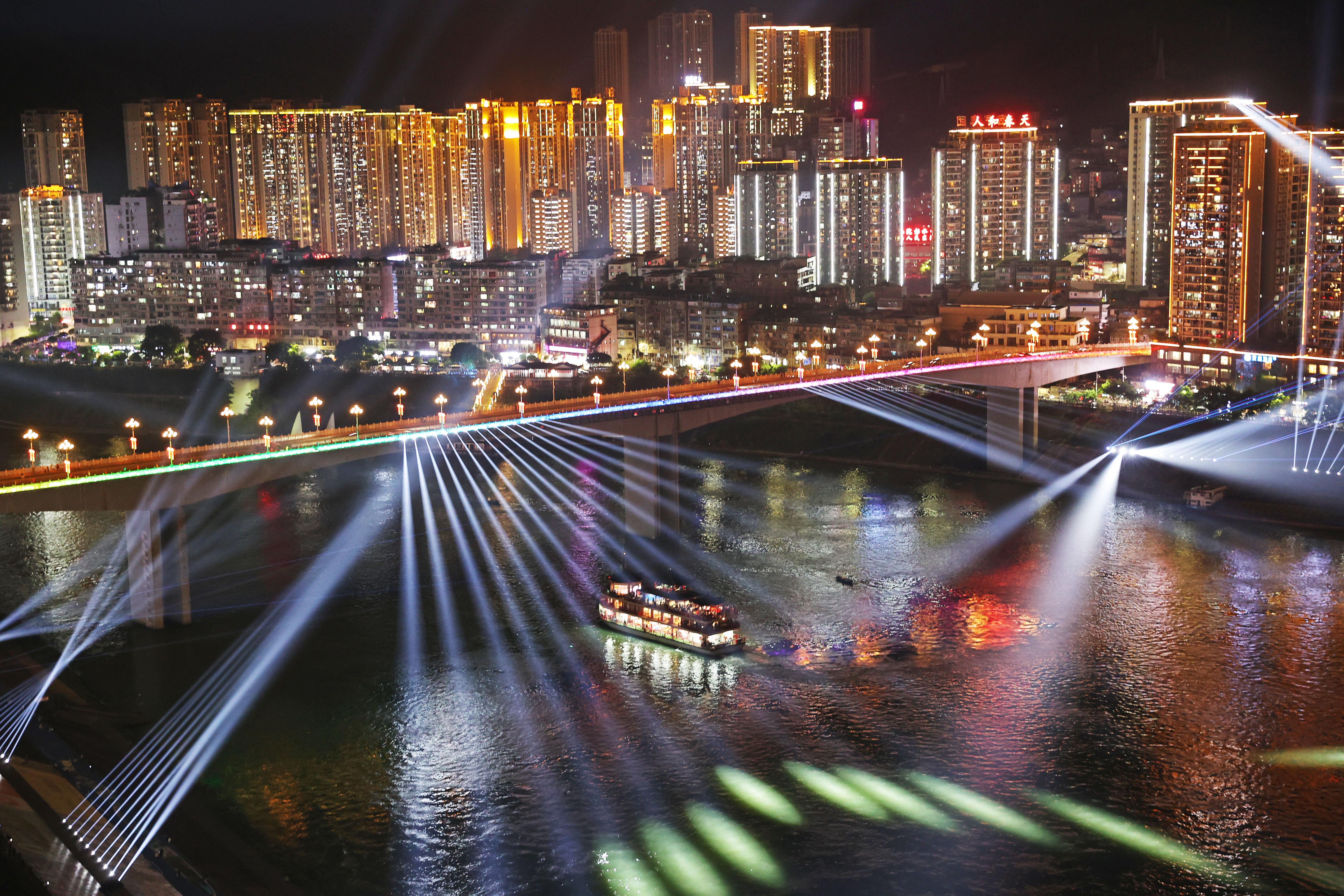 彭水九黎旅游运输服务有限公司副总经理蒋伟介绍,今年以来彭水县利用两江交汇的自然禀赋,持续改造完善城市灯饰、丰富水幕电影内容,打造全新的“彭水之约·梦境乌江”主题夜游。今年1至8月,夜游乌江项目接待游客数量同比增长37.2%。