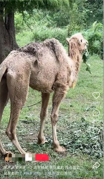 近日,有网友在社交平台发帖称,“求求大家关注一下这只骆驼,景区里的,拴在路边,后背都烂了。”