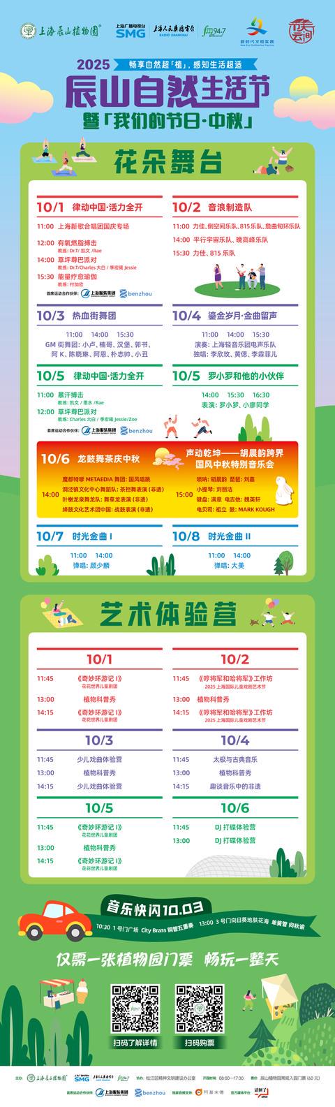 本届舞台特邀上海轻音乐团演绎爵士与流行经典,上海街艺“最杰出艺人”、人气歌手罗小罗也将亲临现场,用温暖声线传递治愈力量。中秋佳节更特别呈现非遗演出,以及由国家一级演员、上海民族乐团唢呐演奏家胡晨韵带来的跨界音乐会——唢呐、琵琶与电吉他巧妙相融,演绎别样国风新意。让每一位走进自然的游客,都能在这里感受到舞台所带来的炽热魅力。