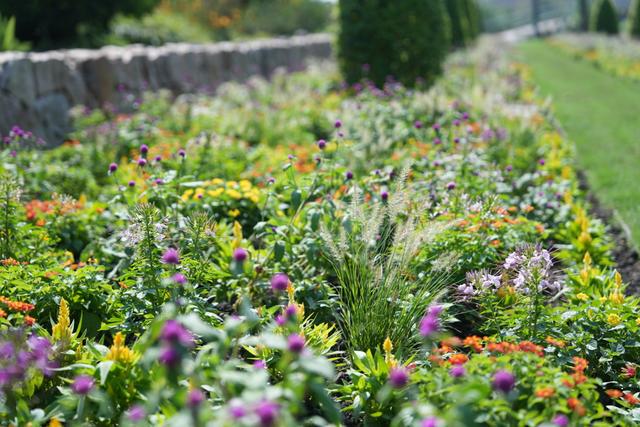 “草卷云舒”展区中,栩栩如生的草编水牛与蓬松层叠的草卷营造出浓郁田园气息,东湖畔的矢车菊、秋石竹与狼尾草点缀着湖岸,勾勒出都市“阿勒泰”般的治愈画卷。“石畔花绘”展区面积约1800平方米的自然式混合花甸,以疏密有致的自然式混合花甸呈现野趣盎然的秋日画卷。
