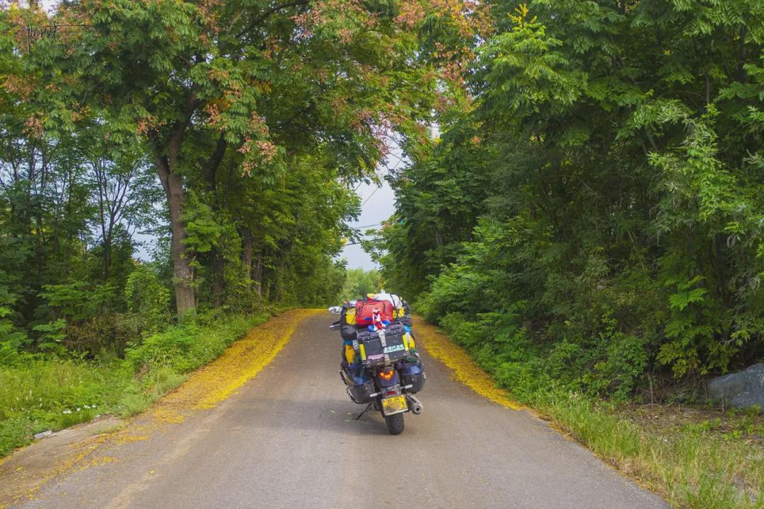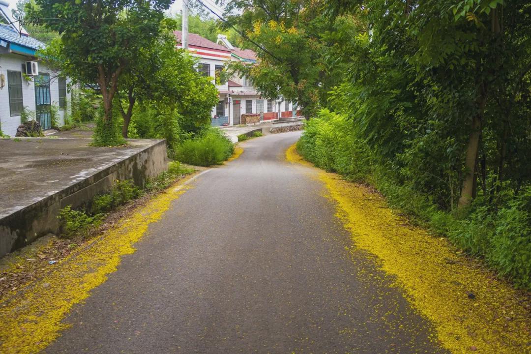 让我非常意外的是,这条小路其实是当地的026县道,蜿蜒曲折穿越数个村庄,全线几乎种满了“全冠栾树”(事后做功课查的)。恰逢夏秋交替,正是这种奇特苗木最落英缤纷又最多彩多姿的时节,而最令人惊艳的,便是这些散落满地的黄色小花。