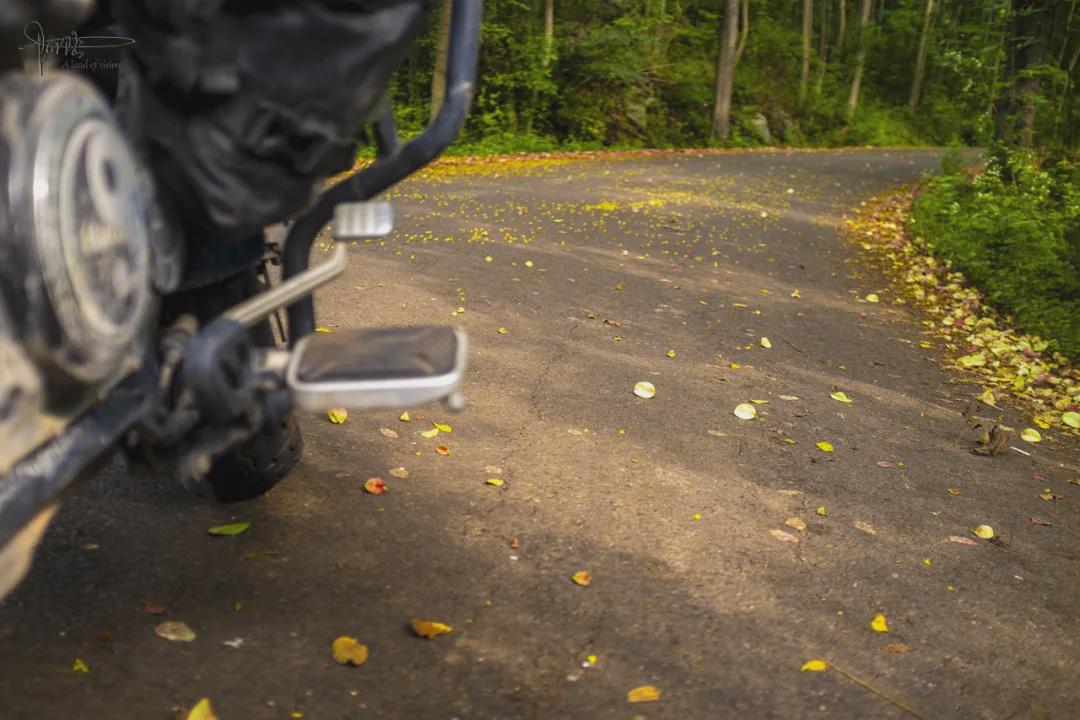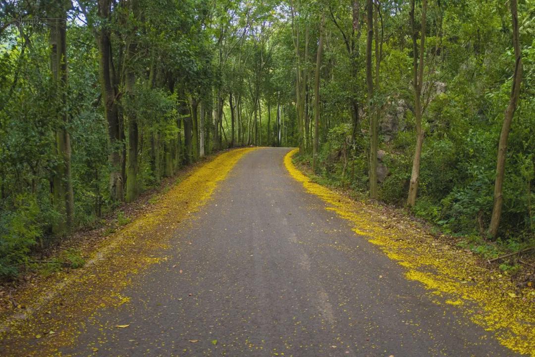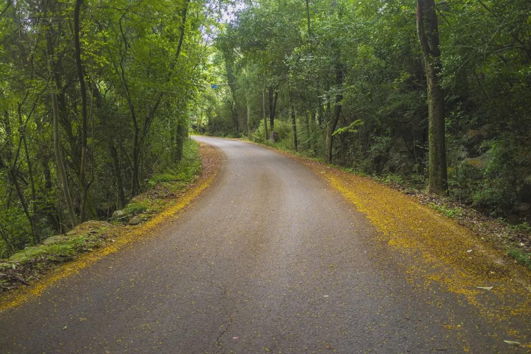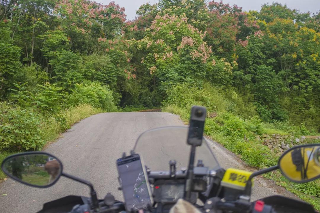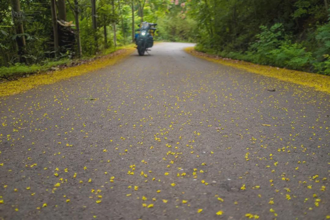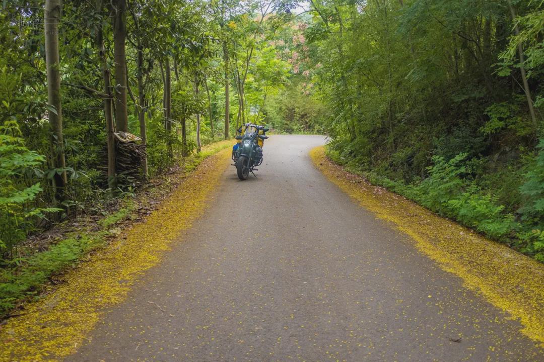 026县道的车流量不大,只偶尔才会有小车或者当地村民的农用三轮车经过,所以大部分落叶花瓣都只被略微地“扫”至道路两边,它们宛如鲜艳的地毯一般,把整条山路渲染地就像是一幅幅生动油画,行车穿梭在郁郁葱葱的林间,整体环境不单清新自然还充满生机,能给人带来一种宁静致远的森林氛围,这种感觉确实有点别具一格。