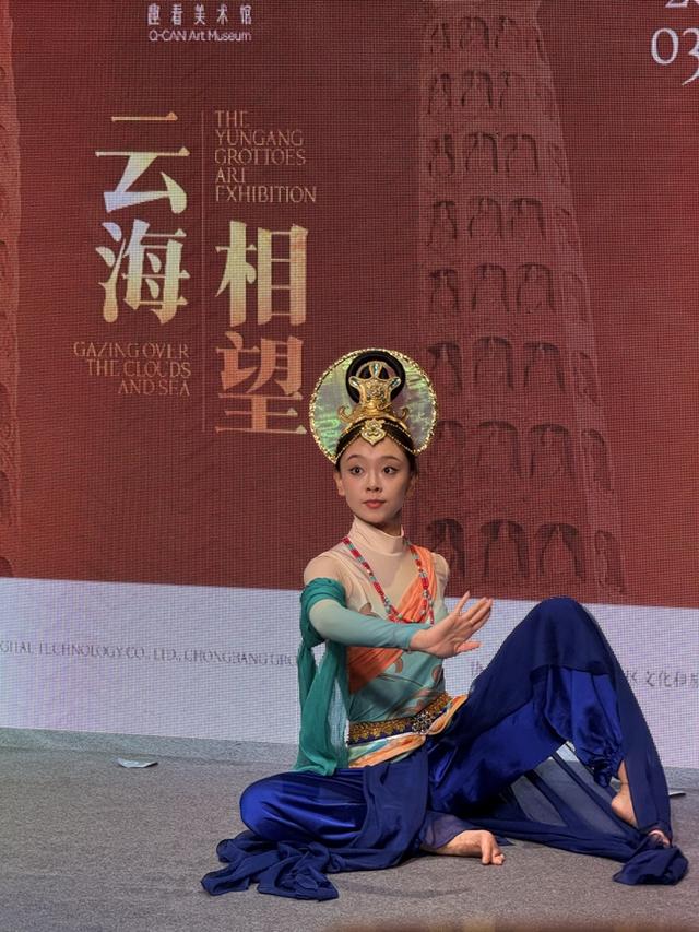 在沉浸于“音乐窟”之后,观众还可以欣赏到以该石窟飞天等形象姿态为蓝本高度还原的云冈乐舞展演。这支乐舞由本次展览的执行策展人、2022北京冬奥会开幕式分场导演田晴执导编排,巧妙将石壁上“沉睡”千年的伎乐塑像转化为真人演绎。展览期间每周末和节假日,这支云冈乐舞都将在今潮八弄定期上演。