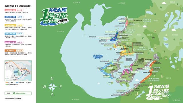 为优化游客体验,公路还重点打造了6条精华路段,包括北太湖稻香田园、西京湾运动聚落、光福山野追光、金庭太湖生态岛、东山半岛古村茶香、东太湖S湾,每条路段均串联特色景点与体验项目,实现“快进抵达,漫游入心”。