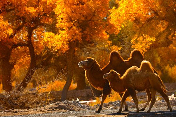 秋季,额济纳旗的胡杨林在广袤的沙漠中绚烂而壮烈。9月底至10月中旬是胡杨林的最佳观赏期,此时的额济纳旗晴朗少云,白天地表在强烈日照下迅速升温,最高气温可达22至25℃;夜晚热量又快速散失,最低气温可能降至5至9℃。巨大的温差有利于胡杨叶片合成花青素,因此,额济纳旗的秋色饱和度极高,金黄纯粹。