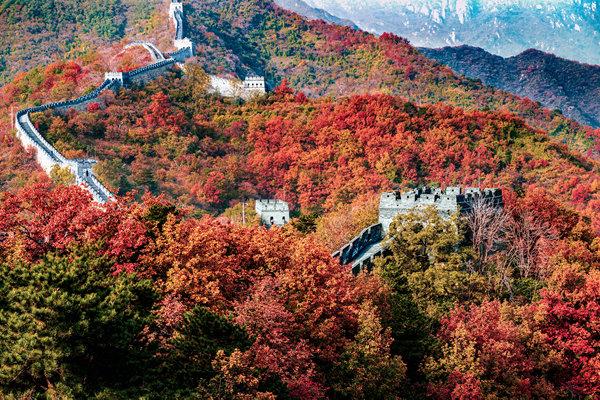 秋高气爽是北京秋天的主旋律,这种天气也直接提升了赏秋体验,特别是站在蜿蜒的万里长城上。在漫山红遍、层林尽染的簇拥下,巨龙般的城垣更能凸显历史的雄浑与壮丽。