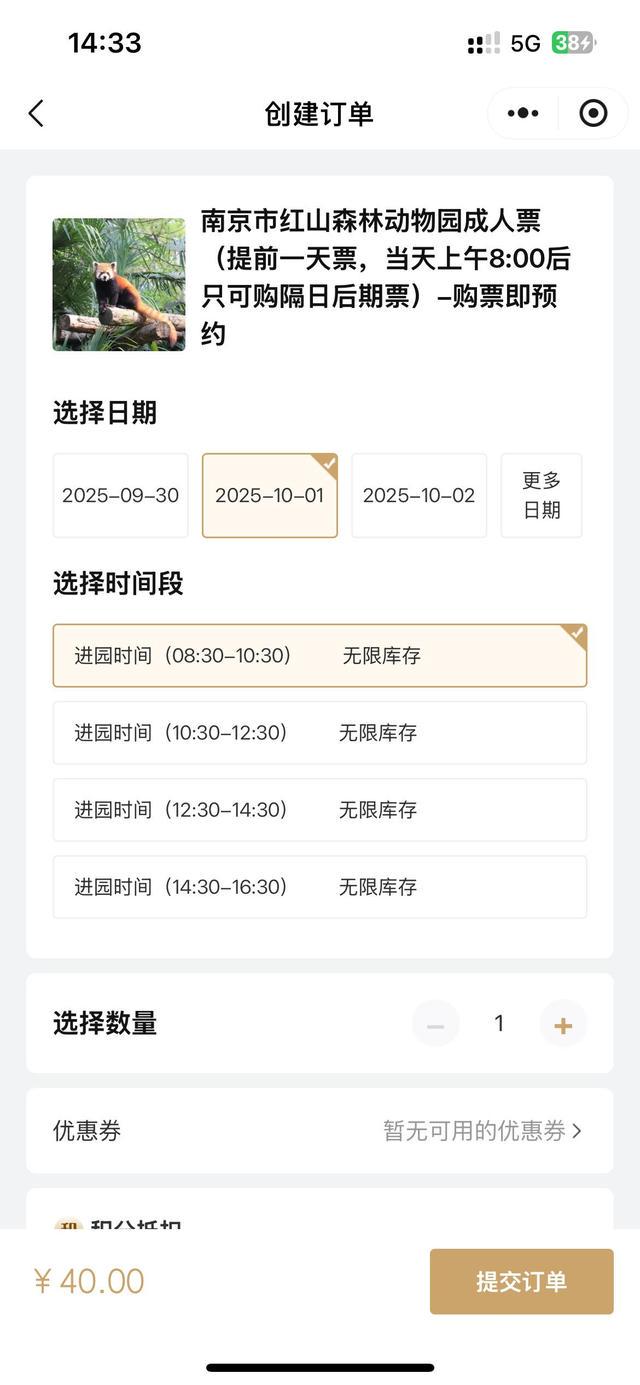 若选择现场购票,必须提前在线上完成预约。操作路径为:关注“南京市红山森林动物园”微信公众号,根据提示选择对应预约类型,生成预约码后,凭码到现场购票窗口购票。