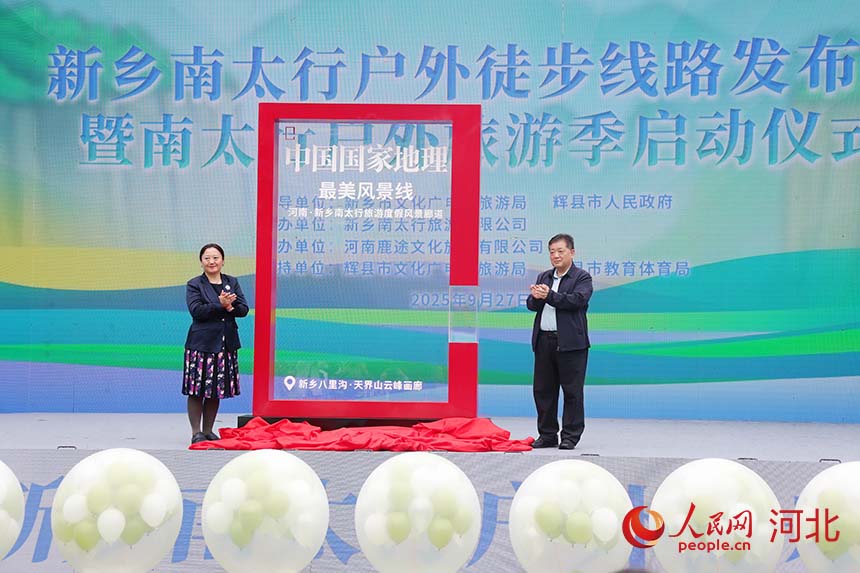 人民网新乡9月29日电 (席彪)9月27日上午,2025新乡南太行户外徒步线路发布会暨南太行户外旅游季启动仪式在河南省新乡市辉县八里沟山门广场举行。会上,中国国家地理为新乡南太行景区授牌“中国国家地理·南太行最美风景线”。