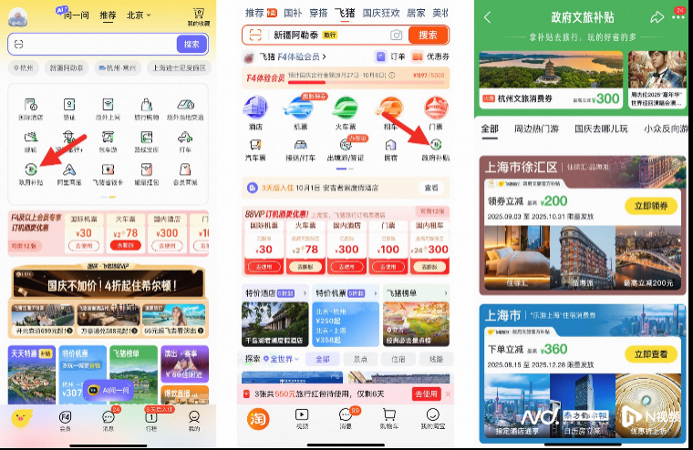 除了体验与效率,出游成本也是用户关心的重点。近日,飞猪平台正式上线了“政府补贴”专属入口,为国庆出游的游客带来了实实在在的优惠。消费者通过飞猪App、淘宝App飞猪频道,或直接在飞猪App搜索“政府补贴”,即可进入专区,集中浏览并领取全国超50个目的地的文旅消费券。