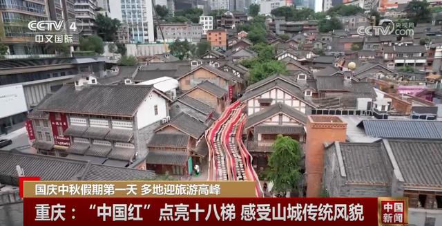 重庆市渝中区的十八梯传统风貌区在国庆假期挂起了鲜艳的五星红旗。主街上空,四百米长的草帽长街披上了流动的红色长纱,整条街被这抹“中国红”点亮。人们穿梭在古色古香的建筑间,感受山城错落立体的独特地貌。10月1日,预计这里将接待游客超过10万人次,