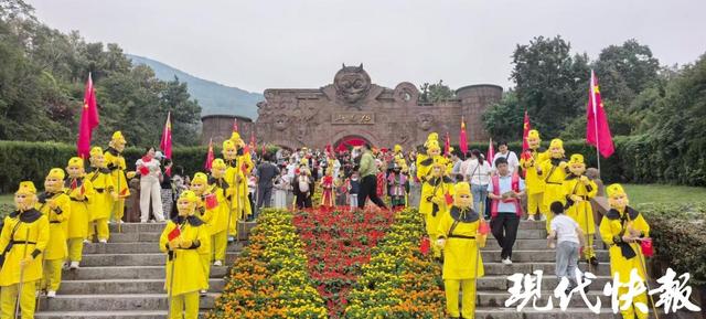 在老山门广场,游客与西游巡演团队精彩互动,共唱红歌,形成一片涌动的红色海洋,将节日气氛推向高潮。在领唱者的带领下,游客们手持国旗,齐声高歌《歌唱祖国》,每个人的脸上都洋溢着自豪与喜悦。“今天我们来到花果山,景区这个红歌快闪活动非常好,我们在游览之余,还能感受国庆浓厚的氛围,这样的双节体验特别有意义。”来自河北邯郸的游客张女士激动地说。
